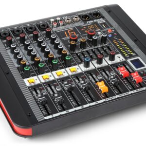 Power Dynamics – PDM-M604A – MEZCLADOR DIRECTO AMPLIFICADO 6 CANALES, 2 x 200 W. RMS, ncluye mute y solo en cada canal, reproductor por USB con display digital y receptor BT para audio