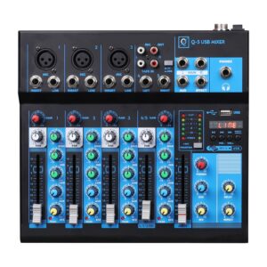 OQAN AUDIO Q5 USB MIXER MK2 – Mesa de mezclas analógica PA , de 5 canales con reproductor de MP3 USB / Bluetooth. (3 canales mono + 1 estéreo).