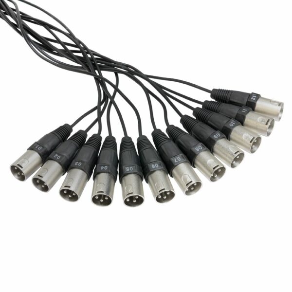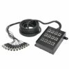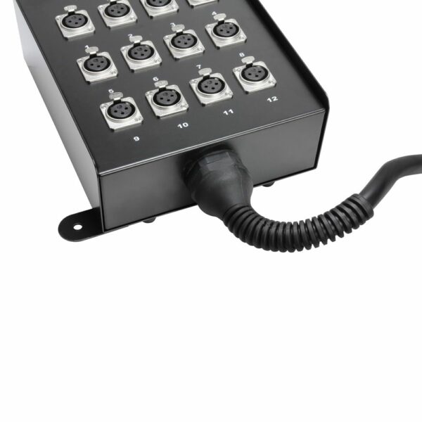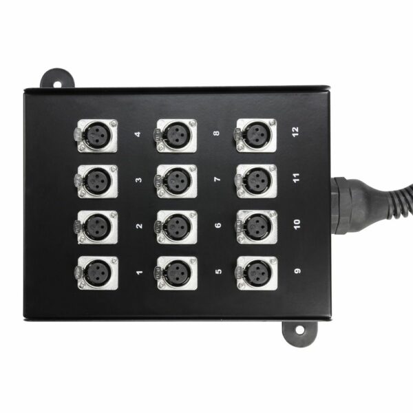 Cód. K12C10 A.H. Cables K12C10 – Manguera de Cable con Cajetín de Escenario 12/0, Cable de 10 metros Cajetín de escenario de 12 canales de sólida construcción, manguera de 10 metros de longitud y terminada en doce conectores XLR Adam Hall. Cajetín de escenario completamente metálico que dispone de un sólido manguito protector en la unión entre el cajetín y la manguera, así como de una oreja de fijación. La robusta unión evita tensiones y roturas en el cable.