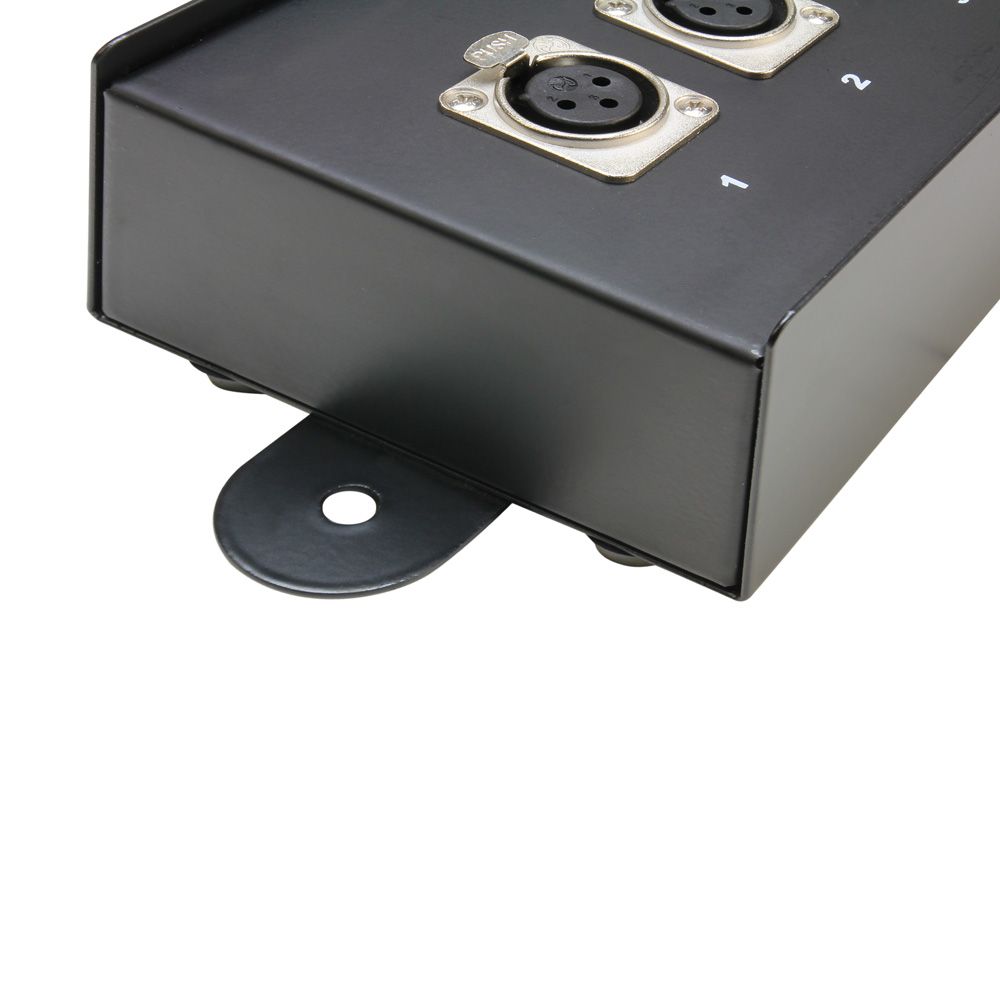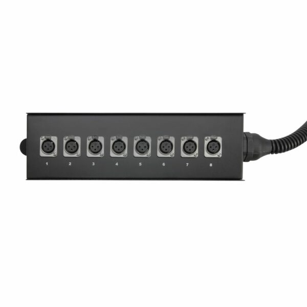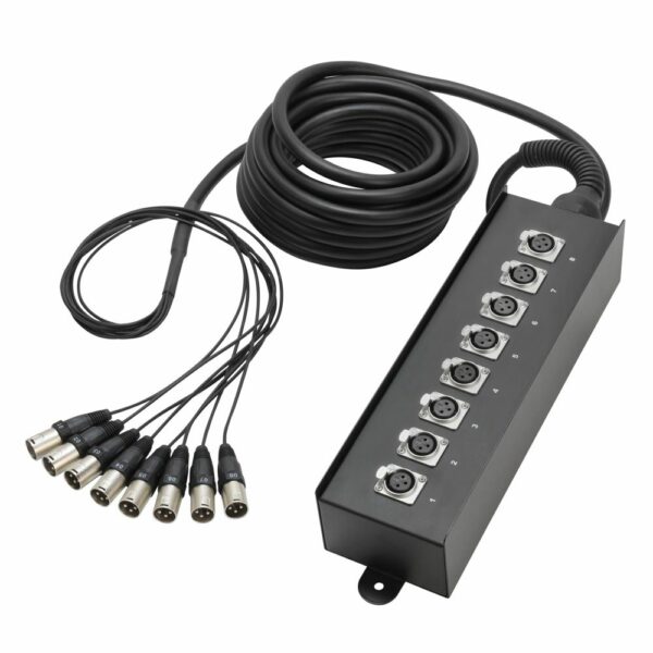 Cód. K8C10 A.H. Cables K8C10 – Cajetín de Escenario 8/0, con cable de 10 metros Cajetín de escenario de 8 canales de sólida construcción, manguera de 10 metros de longitud y terminada en ocho conectores XLR Adam Hall. El cajetín de escenario de metal tiene una oreja de fijación en el lateral y un sólido manguito protector en la unión entre la caja y la manguera. La robusta unión evita tensiones y roturas en el cable.