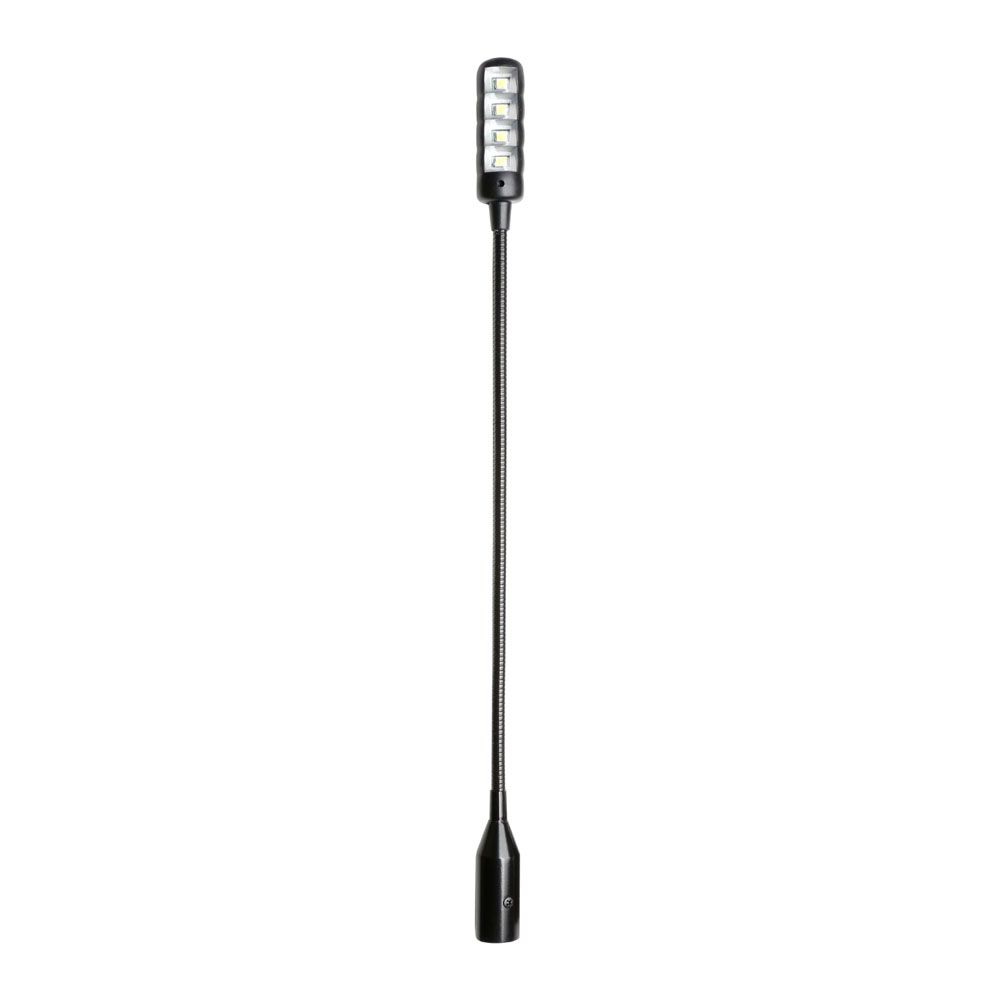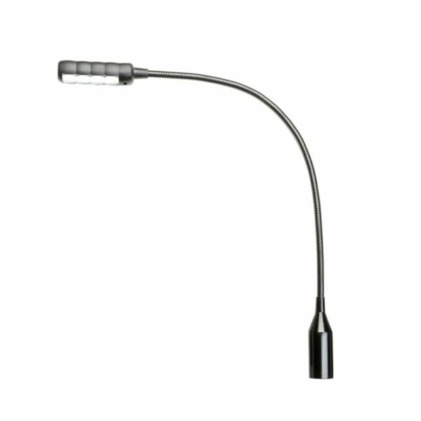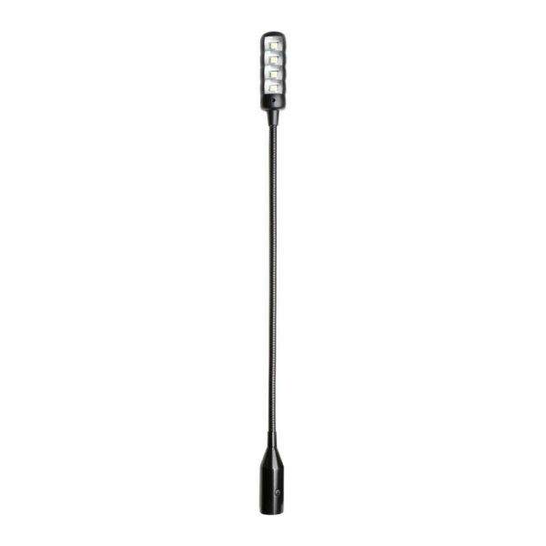 La SLED 1 ULTRA XLR 3 es una lámpara flexo de color negro mate con 4 LED COB muy brillantes y conexión XLR macho de 3 pines. Puede alimentarse mediante la alimentación fantasma de 12 o 48 voltios de una entrada de micrófono. El flexo de 30 cm de longitud es flexible, pero muy robusto; el interruptor de encendido/apagado se encuentra fácilmente accesible en la cabeza de la lámpara.