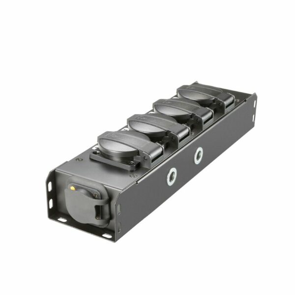 Diseñada para una conexión en cadena fácil, la regleta de alimentación PROPORT 4T proporciona 4 tomas de corriente con conexión a tierra tipo F con cubiertas de tapa abatibles individuales más conectores de E / S de potencia negros y amarillos. Los puntos de suspensión M10 son ideales para una distribución de energía limpia y personalizada en etapas, trusses y plataformas de engranajes.