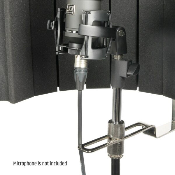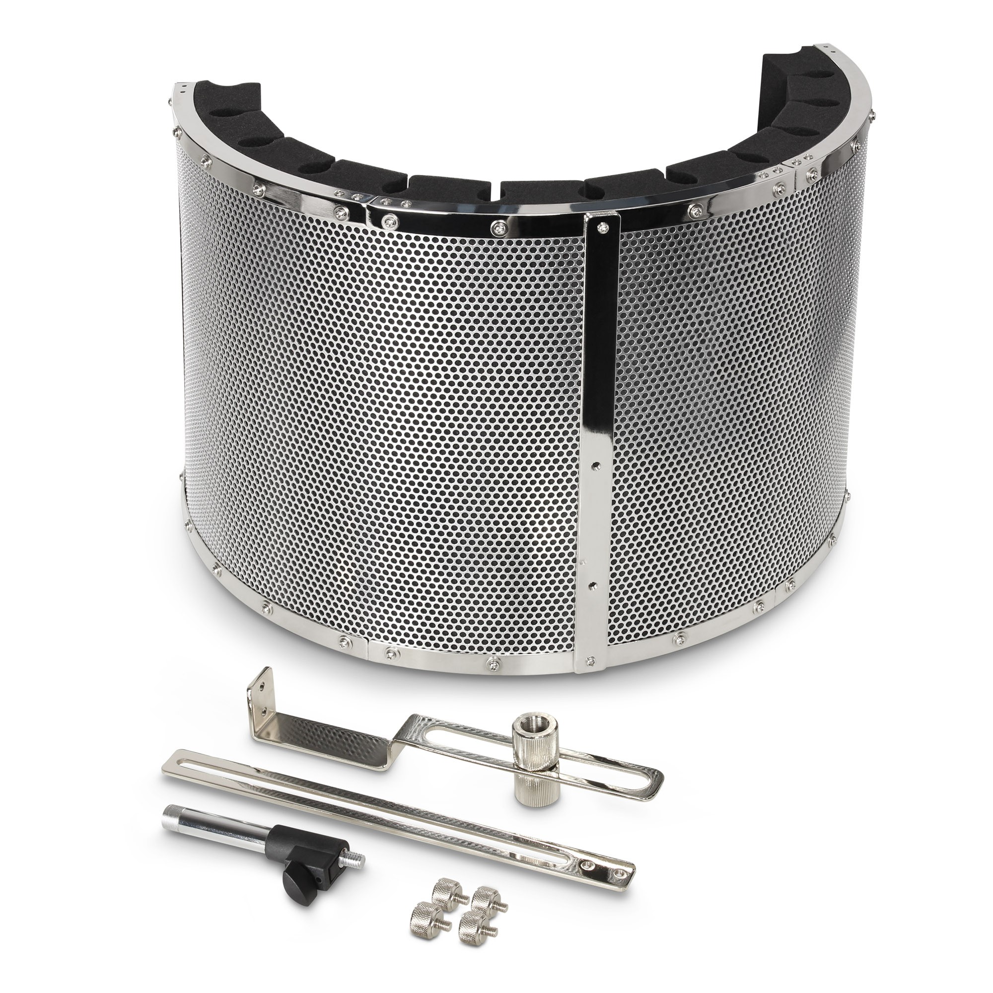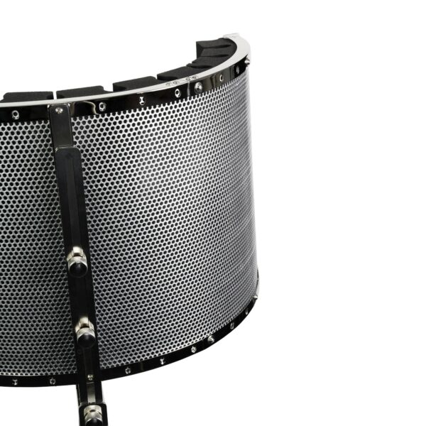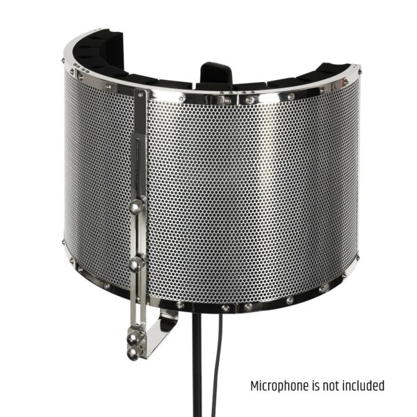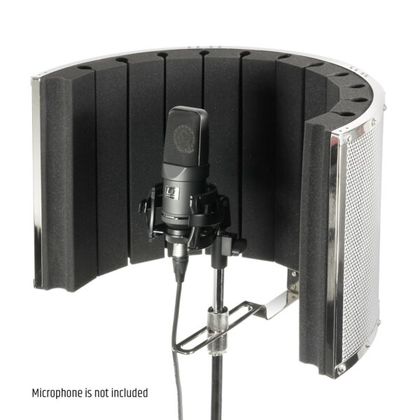Cod. SLDRF1 Adam Hall Stands RF1 Microphone Filter – Pantalla para Micrófono de estudio Pantalla para Micrófono de estudio Diseñado para eliminar las reflexiones, ruidos, reverberaciones y ecos, y conseguir una señal vocal o instrumental “seca”. Permite una buena grabación en situaciones poco favorables, sin tener que tomar medidas complicadas para reproducir las condiciones técnicas o el aislamiento acústico propios de un estudio. El soporte para micrófono de la pantalla RF1 es ajustable en profundidad y en altura, lo que permite tomar un sonido seco excelente con cualquier tipo de micrófono de gran diafragma.