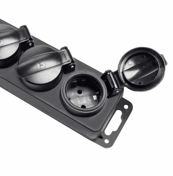 La 8747 IP 5 es una base de enchufes de 5 vías con un cable de 1,4 m y enchufe con toma de tierra CEE 7/7. Gracias a la protección IP44 está indicada para uso en exteriores y está protegida contra el agua y cuerpos extraños mayores que 1 mm de diámetro.