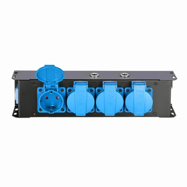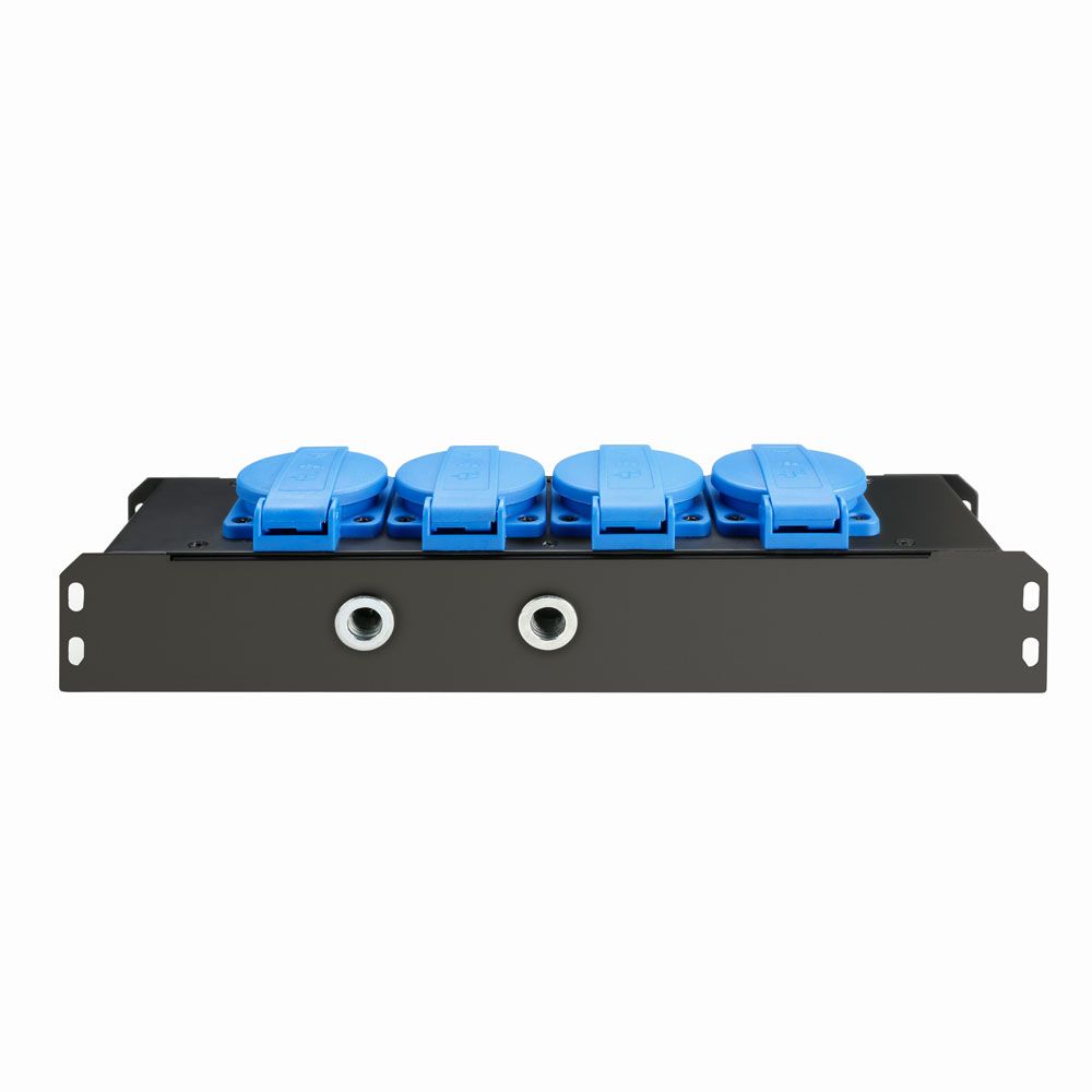 La base de enchufes PROPORT 4 es ideal para distribuir la tensión eléctrica de forma ordenada y selectiva en escenarios, trusses y rigs. Su robusta carcasa metálica dispone de 4 tomas con tierra y tapa, un conector azul y otro blanco para entrada y salida de la alimentación eléctrica, así como dos roscas M10 para montar volada y en instalación fija.