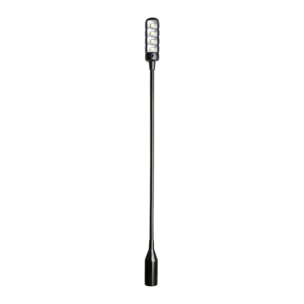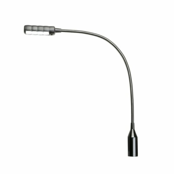 La SLED 1 ULTRA XLR 4 C es una lámpara flexo de color negro mate con 4 LED COB muy brillantes y conector XLR de 4 pines, que puede funcionar con alimentación fantasma de 12 o 48 voltios. El flexo de 30 cm de longitud es flexible, pero muy robusto; el interruptor de encendido/apagado se encuentra fácilmente accesible en la cabeza de la lámpara.