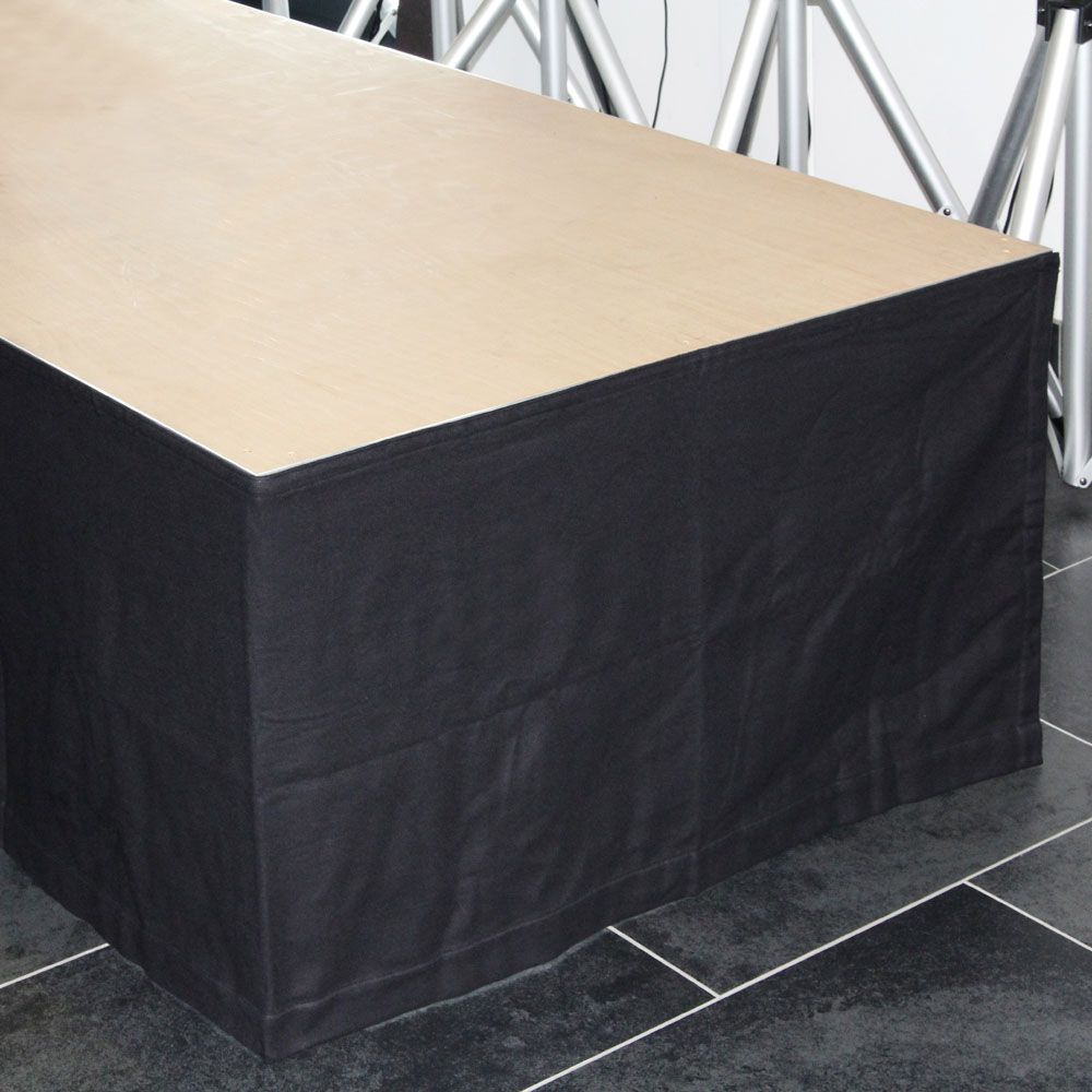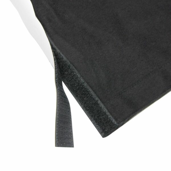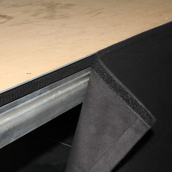 Cód. 0153X210 Adam Hall Accessories, 0153X210 – Tela, Faldón B1 para escenario con Velcro 2 x 1 m Tela moltón opaca de color negro tratada con retardante de llama (B1 según DIN 4102) y con un gramaje de 300 gramos. La tela está provista de una cinta velcro autoadhesiva, lo que permite fijarla fácilmente en plataformas o estructuras similares y también despegarla en cualquier momento. Cinta de bucles cosida con terminación de cinta de velcro Refuerzos izquierdo y derecho Ribete inferior de 5 cm con laterales abiertos