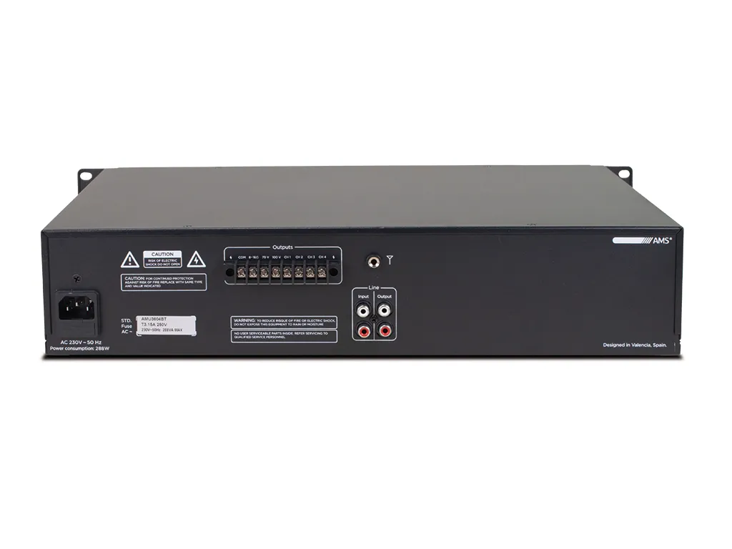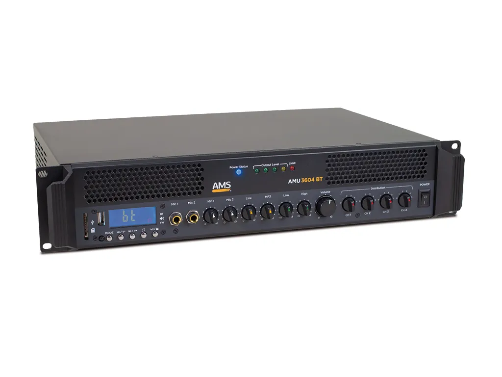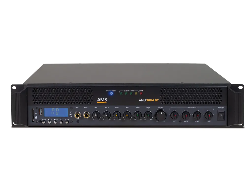 AMS – Power amplifier/mixer. 360 W @ 8-16 Ohm. 70/100V line. 4 zones. MP3 player. USB/SD/BT/FM.