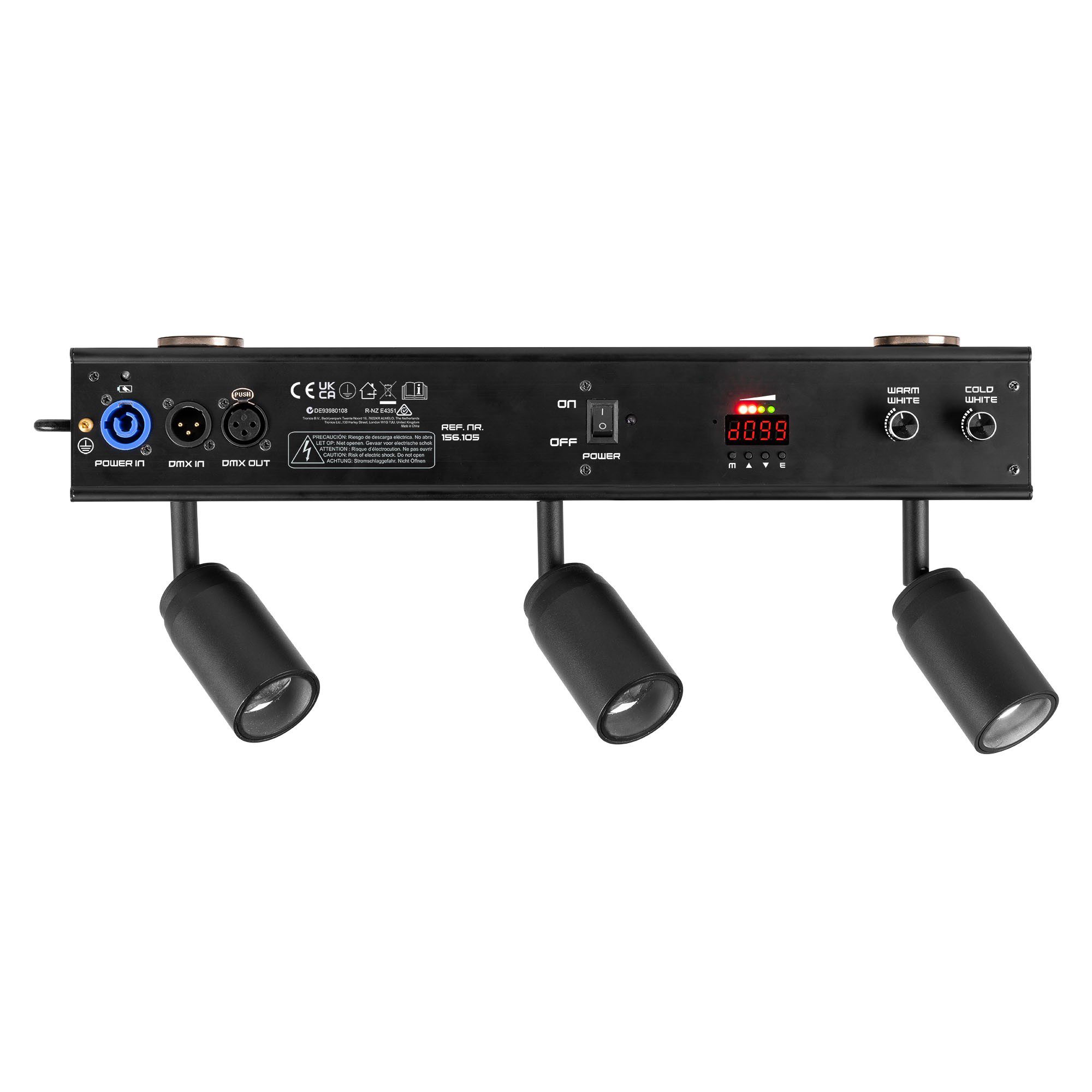 Cód. 156.105 BeamZ – EZYBar3 – Barra LED COB alimentada por batería El EZYBar3 es una barra LED inalámbrica innovadora y de diseño elegante que redefine la forma en que se iluminan banquetes, stands de presentaciones, jardines y todo tipo de eventos. El EZYBar está equipado con una batería incorporada y tiene tres potentes fuentes de luz LED COB de 10W que se pueden mezclar en todos los tonos blancos imaginables, con temperaturas de color de 2700K a 6900K. El sencillo sistema de montaje con puntos ajustables (función de zoom) y dos potentes imanes se pueden orientar en cualquier dirección para…