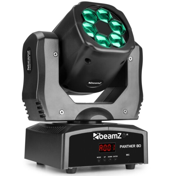 Cód. 150.440 BeamZ – PANTHER 80 CABEZA MÓVIL LED CON LENTES ROTATIVAS, 6x 12W 4-en-1 CREE RGBW LEDs, Shows Pre-programados Ritmo de la música con ajuste de sensibilidad,DMX y autonomo Descripción La Panther 80 es una cabeza móvil LED compacta, super rápida y ligera que usa unos potentes leds 6x 12W CREE RGBW 4-en-1. La Panther 80 está equipada con motores silenciosos ultra rápidos complementados con lentes rotativas sin fin para crear un efecto único. Este efecto compacto pesa tan solo 3 kg, por lo que puede colocarse en cualquier posición. Con los shows internos y su alta velocidad, la…