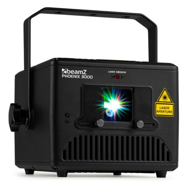 Cód. 152.542 BeamZ – Phoenix 3000 – Sistema láser analógico, Proyector láser RGB a todo color de 3 W , Modo DMX y autónomo La serie de láseres beamZ Phoenix ofrece potentes láseres de animación con más de cien efectos y patrones integrados. Estos láseres cuentan con modulación analógica, lo que permite mostrar hasta 16,7 millones de tonos de color y la posibilidad de atenuar la salida del haz láser para la seguridad del público. El panel trasero incluye una entrada/salida DMX con conectores XLR de 3 pines y una conexión de entrada/salida ILDA, el estándar para conectar pantallas láser…