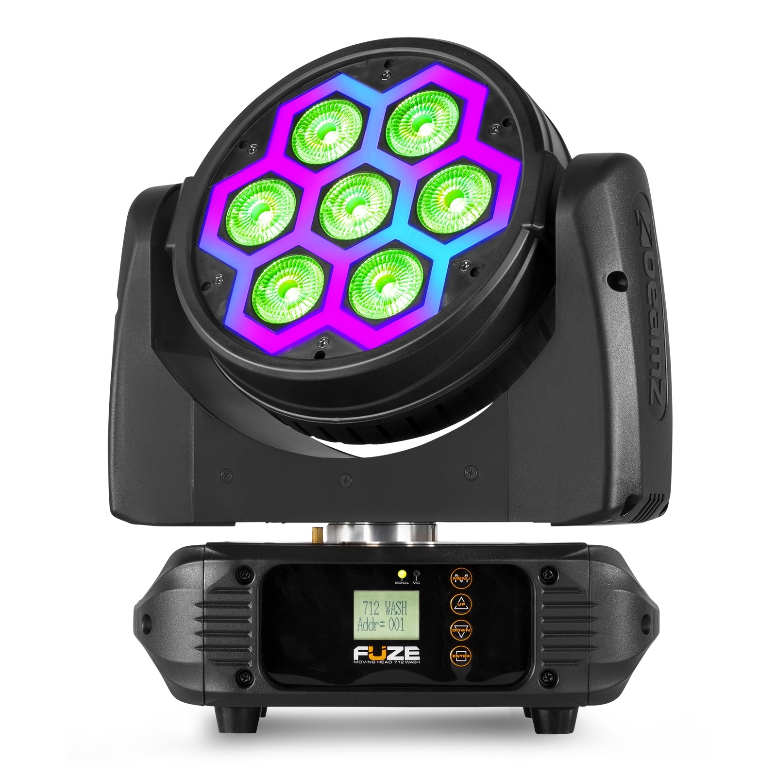 BeamZ Pro – FUZE712 CABEZA MÓVIL WASH CON EFECTO LED SMD – 7x 12W 4-en-1 LEDs RGBW (rojo, verde, azul, blanco) 60x LEDs SMD para efecto Neon Temperatura de color lineal 2800K-8000K Control total por LED 23 o 28 canales DMX DMX, Auto, Ritmo de la música y color estático Master/esclavo 0-100% Dimmer Electrónico