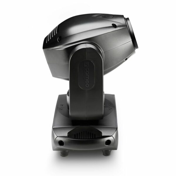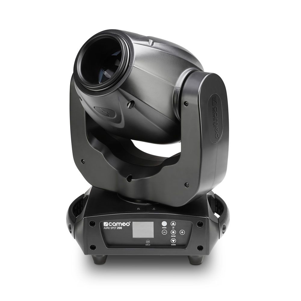El AURO® SPOT 200 de Cameo es una cabeza móvil compatible con RDM, con una resolución de 16 bits y una capacidad de giro de 630° en horizontal y 235° en vertical, que está equipada con motores de 3 fases de alta velocidad y LED ultrabrillantes de 100 W. Ocho colores intensos, además de blanco y colores divididos, seis gobos intercambiables y un prisma giratorio de 3 caras consiguen efectos de iluminación espectaculares. El AURO® SPOT 200 ofrece los modos DMX de 5 canales, 13 canales y 22 canales, funciona en modo automático o controlado por el sonido, y también se puede utilizar en los modos maestro, esclavo y autónomo. Incluye, entre otras características, cuatro curvas de atenuación, efectos de sacudida (Shake) y un estrobo de hasta 20 destellos por segundo. La robusta carcasa está equipada con un ventilador silencioso controlado por temperatura, conectores de 3 y 5 pines para la señal DMX y conectores powerCON de Neutrik, así como una pantalla LCD con 4 botones para realizar los ajustes fácilmente. El AURO® SPOT 200 puede funcionar con una tensión de 100 a 240 voltios.