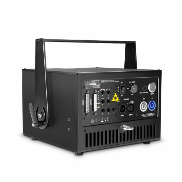 El D.FORCE 5000 RGB presenta un escáner de alta velocidad de 30 Kpps a 8 grados de ILDA, un amplio ángulo de escaneo de 50 ° y una interfaz ILDA en conectores D-sub de 25 pines para control de software.