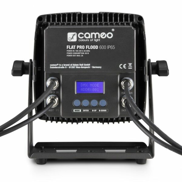 Cód. CLFLOOD600IP65 Cameo FLATPROFLOOD600IP65 – Proyector IP65 con 9 LED RGBWA+UV 6 en 1 de 12 W Proyector IP65 de exterior de gran versatilidad Ofrece una perfecta mezcla de colores sólidos y pastel, e intensos efectos UV Sin parpadeo 6 modos de control DMX además de funcionamiento en modo maestro, esclavo o autónomo Pantalla LCD con cuatro botones que permiten realizar ajustes fácilmente Función de bloqueo para evitar cambios no autorizados en los ajustes del menú Carcasa metálica robusta y muy compacta Conectores roscados para la señal DMX y la alimentación eléctrica Incluye un soporte de montaje universal