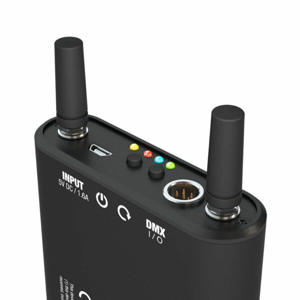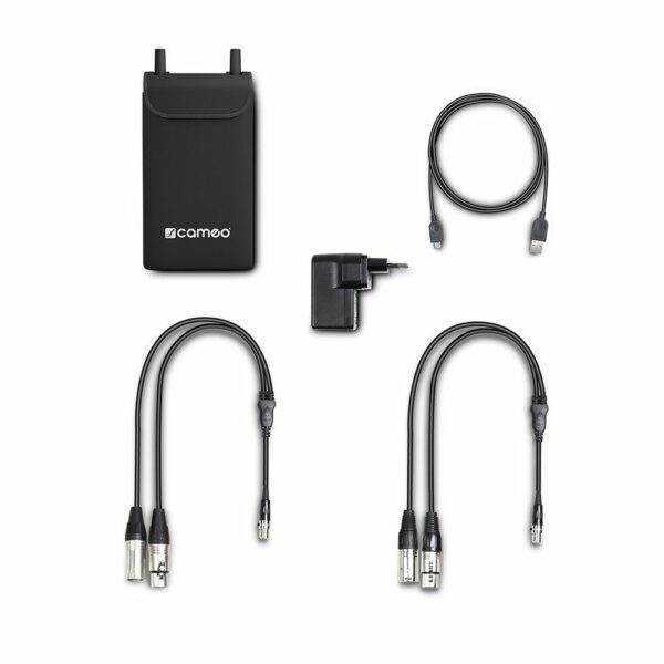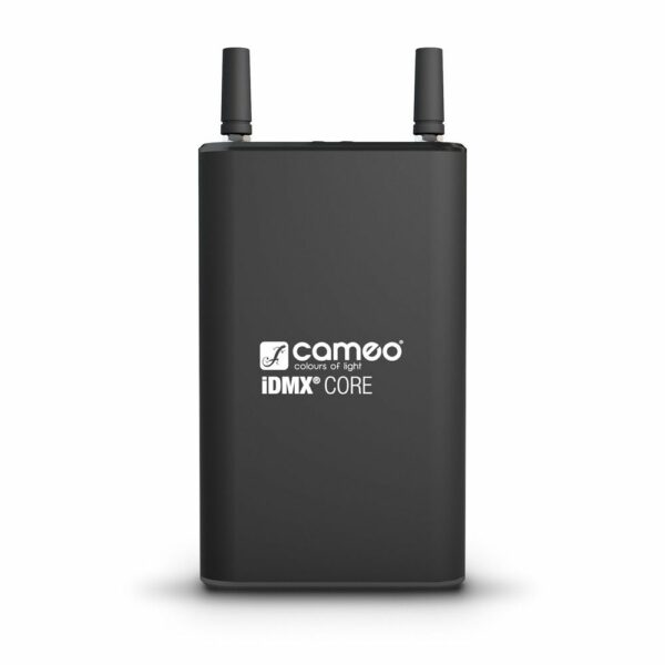 El control inalámbrico de la iluminación con dispositivos iOS y Android está al alcance de su mano con la iDMX® CORE Box de WiFi a W-DMX™. Este dispositivo de batería se ha desarrollado especialmente para su uso con la aplicación iDMX® Controller de Cameo e integra un transmisor W-DMX™ con un alcance de hasta 300 m, el cual funciona en la frecuencia de 2,4 GHz. Sus entradas y salidas DMX de 3 y 5 pines permiten utilizarlo con mesas de control de luces DMX, así como controlar focos DMX convencionales de forma inalámbrica mediante W-DMX™ (la conexión WiFi se establece solo entre el dispositivo móvil y la iDMX Core). La potente batería de litio de LG Chem permite utilizar la iDMX® CORE Box hasta 9 horas, y también es posible ampliar cuanto se desee la duración de la iDMX® CORE por medio de baterías externas. El sistema integrado de gestión de la batería la protege frente a cargas y descargas excesivas, lo que garantiza una larga vida útil. El volumen de suministro incluye un cargador/adaptador de corriente, una bolsa y cables DMX en Y.