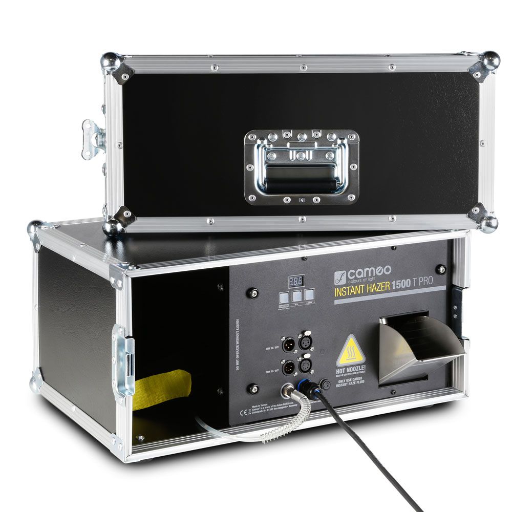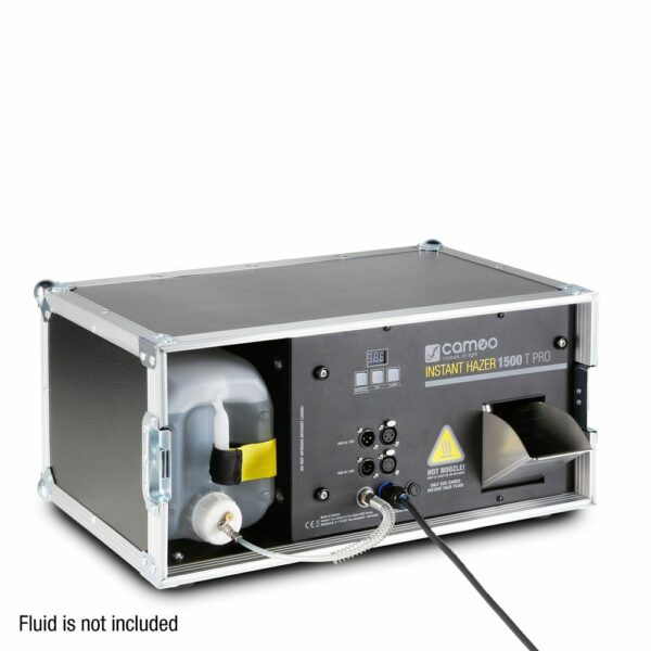 La Instant Hazer 1500 T Pro de la serie Instant de Cameo está provista de un robusto flightcase capaz de soportar las duras condiciones de las giras. Con un caudal de hasta 1020 m³ por minuto, un tiempo de calentamiento de tan solo 45 segundos y un funcionamiento silencioso, es la solución ideal para aplicaciones móviles, como producciones de TV y cine, desfiles de modas, actuaciones en directo y discotecas móviles. Esta máquina de neblina de gran eficiencia está controlada por microprocesador, dispone de tubos de evaporación de acero inoxidable austenítico de gran duración y una función de autolimpieza automática que evita la acumulación de sedimentos y reduce el mantenimiento al mínimo. La emisión de neblina y la velocidad del ventilador se pueden regular en incrementos de 1% para adaptarse a escenarios y salas de cualquier tamaño, y consume solo 17 ml de fluido por minuto al 100% de caudal. La Instant Hazer 1500 T Pro puede funcionar en modo de 2 canales por control DMX y modo autónomo, y dispone de conectores de entrada y salida DMX de 3 y 5 pines. Su robusta carcasa está provista de una pantalla LED de 3 dígitos, un compartimento para bidón de hasta 5 litros y de protección contra sobrecalentamiento. La Instant Hazer 1500 T Pro de Cameo produce una neblina muy fina y de larga duración que aporta un toque favorecedor a cualquier espectáculo de luces con efectos atmosféricos impresionantes. Para obtener los mejores resultados, se recomienda utilizar solo el fluido Instant Haze Fluid de Cameo desarrollado específicamente para máquinas de Cameo. El uso de fluidos no recomendados podría anular la garantía y causar daños en la máquina.