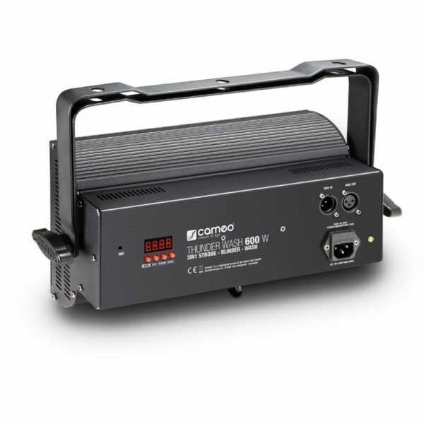 El Thunder Wash de 600 W viene con tomas XLR de 3 pines para la entrada y salida DMX, 5 modos DMX con Dimmer, la frecuencia y la duración del flash , así como la capacidad de funcionar como maestro, esclavo o independiente. Una pantalla de fácil lectura LED con botones para el modo, Enter, Arriba y Abajo se utiliza para la operación manual, mientras que el micrófono incorporado se utiliza para el funcionamiento autonomo mediante el sonido.