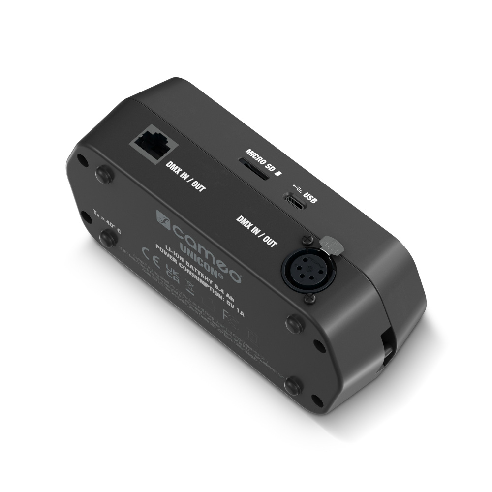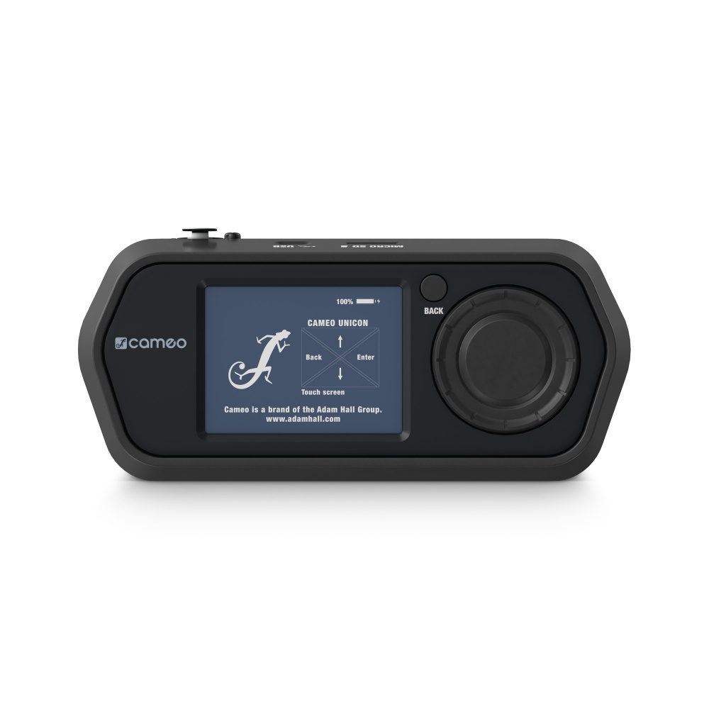 Cód. CLIREMOTE Cameo – UNICON® – Mando a distancia de foco para instalación fija Unidad de configuración y control de dispositivos DMX Pantalla táctil de alto brillo de 2,8″ y encoder para una navegación intuitiva por el menú Transmite señales DMX/RDM hasta un universo DMX – 512 canales Conector DMX de 5 pines, RJ45 y USB-C Batería de litio integrada, 6.500 mAh Ranura para tarjetas microSD para guardar y transferir escenas Lee los datos de los sensores de las luminarias compatibles Actúa como actualizador de firmware para dispositivos compatibles Ojales para correa de transporte. Descripción El UNICON® de Cameo es…