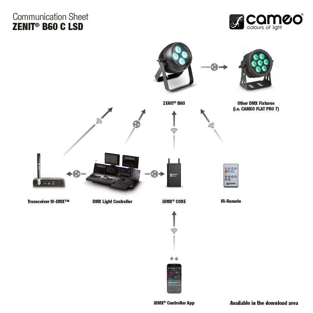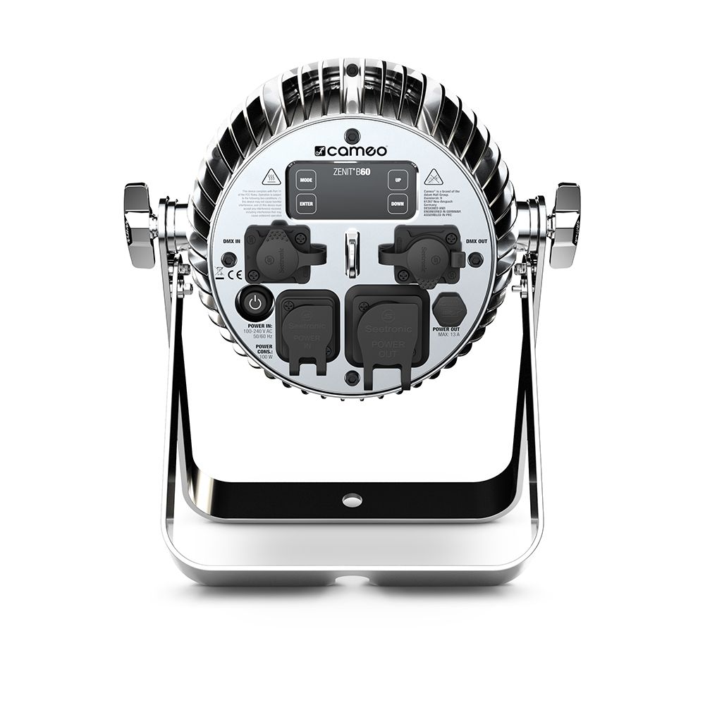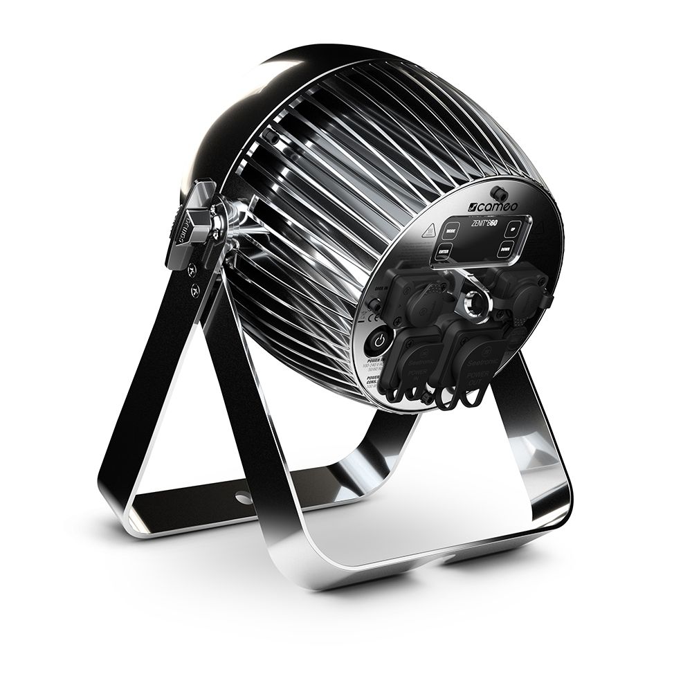 Con funcionamiento a batería, calificación DMX inalámbrica e IP65 incorporada, el Cameo ZENIT® B60 está listo para aplicaciones exigentes de iluminación interior y exterior. El altamente profesional horno de luz PAR con LED Cree de 15 W RGBW con una vida útil de 50,000 horas y una potente salida de 1.900 lm para colores brillantes y uniformes con una dispersión precisa de haz de 11 °. Para ángulos de variación mientras ofrece una opción de ángulos de haz de 25 ° o 40 ° manteniendo la salida. El ZENIT® B60 incorpora un receptor W-DMX ™ de 2,4 GHz. Desarrollado por Wireless Solution AB Sweden, W-DMX ™ se ha convertido en el estándar para el control de iluminación inalámbrico profesional. La batería de ion de litio de gran capacidad de la luminaria está fabricada por LG Chem para proporcionar un rendimiento confiable de hasta 24 horas desde una sola carga con tiempo de funcionamiento ajustable en incrementos de una hora. Un control inteligente calcula automáticamente el brillo y el sistema de administración de la batería de la luz PAR evita la sobrecarga y la descarga exhaustiva para prolongar la vida útil de la batería. Con un rendimiento de 3.600 Hz, el ZENIT® B60 es perfecto para películas y aplicaciones de TV. Utiliza tecnología de 16 bits para una mezcla y atenuación de color uniforme y de alta resolución e incluye la corrección individual de la temperatura del color del LED. La carcasa de aluminio cuenta con una brillante pantalla OLED con cuatro botones táctiles para una fácil configuración, mientras que un bloqueo de seguridad evita el acceso no autorizado al menú.