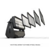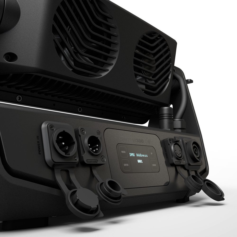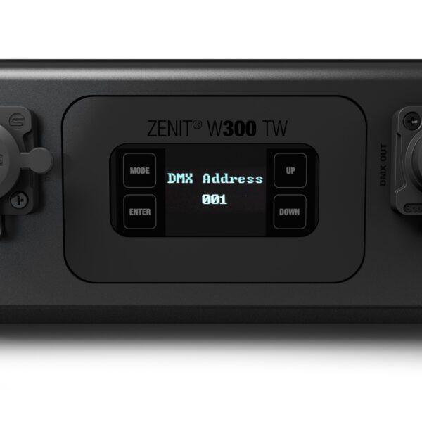 La carcasa de aluminio fundido a presión del ZENIT® W300 TW integra ventiladores con control de temperatura que garantizan un funcionamiento optimizado y silencioso, mientras que una brillante pantalla OLED con cuatro botones táctiles permite una configuración fácil e intuitiva. La luminaria incluye un mando a distancia por infrarrojos, un soporte de montaje omega y un cable de alimentación.