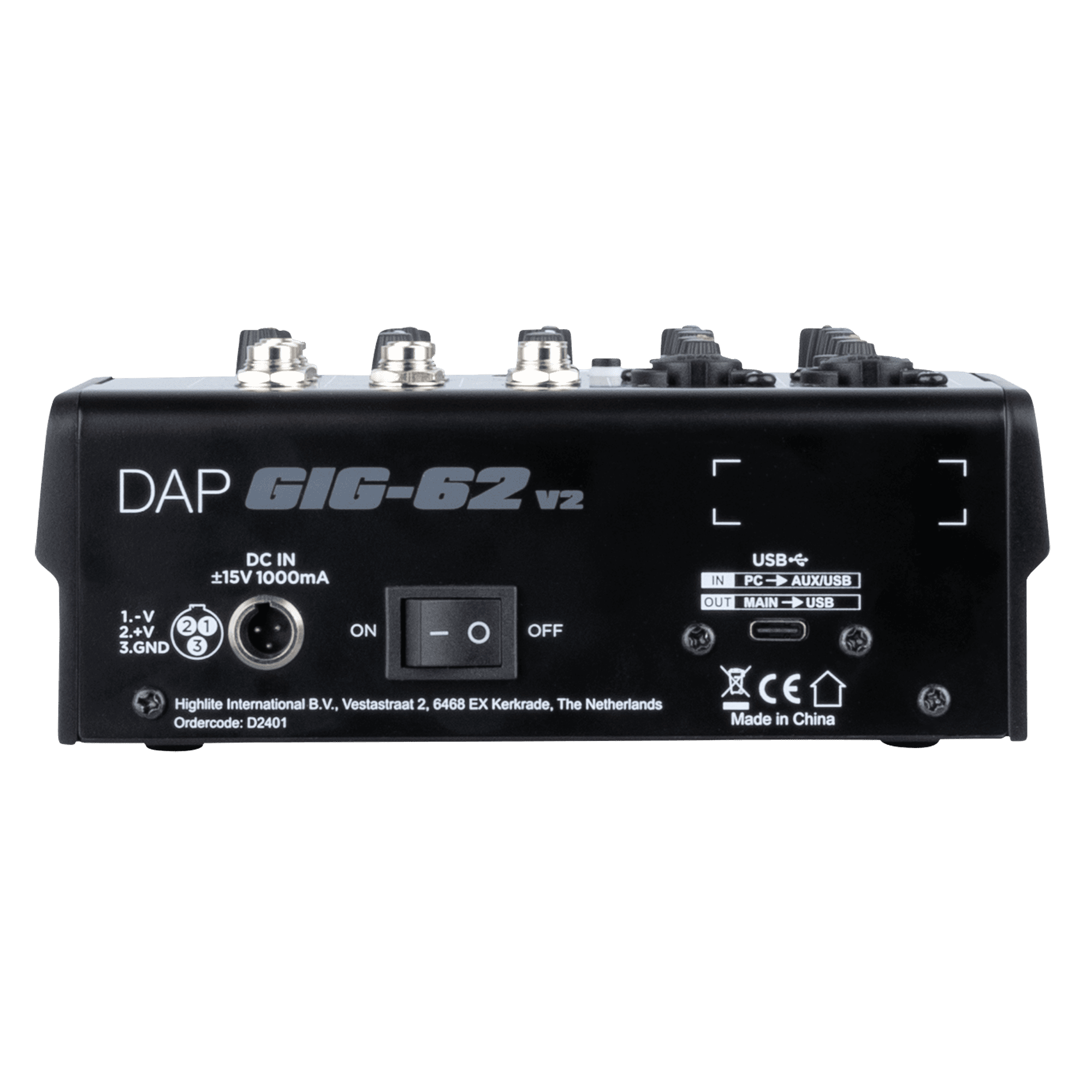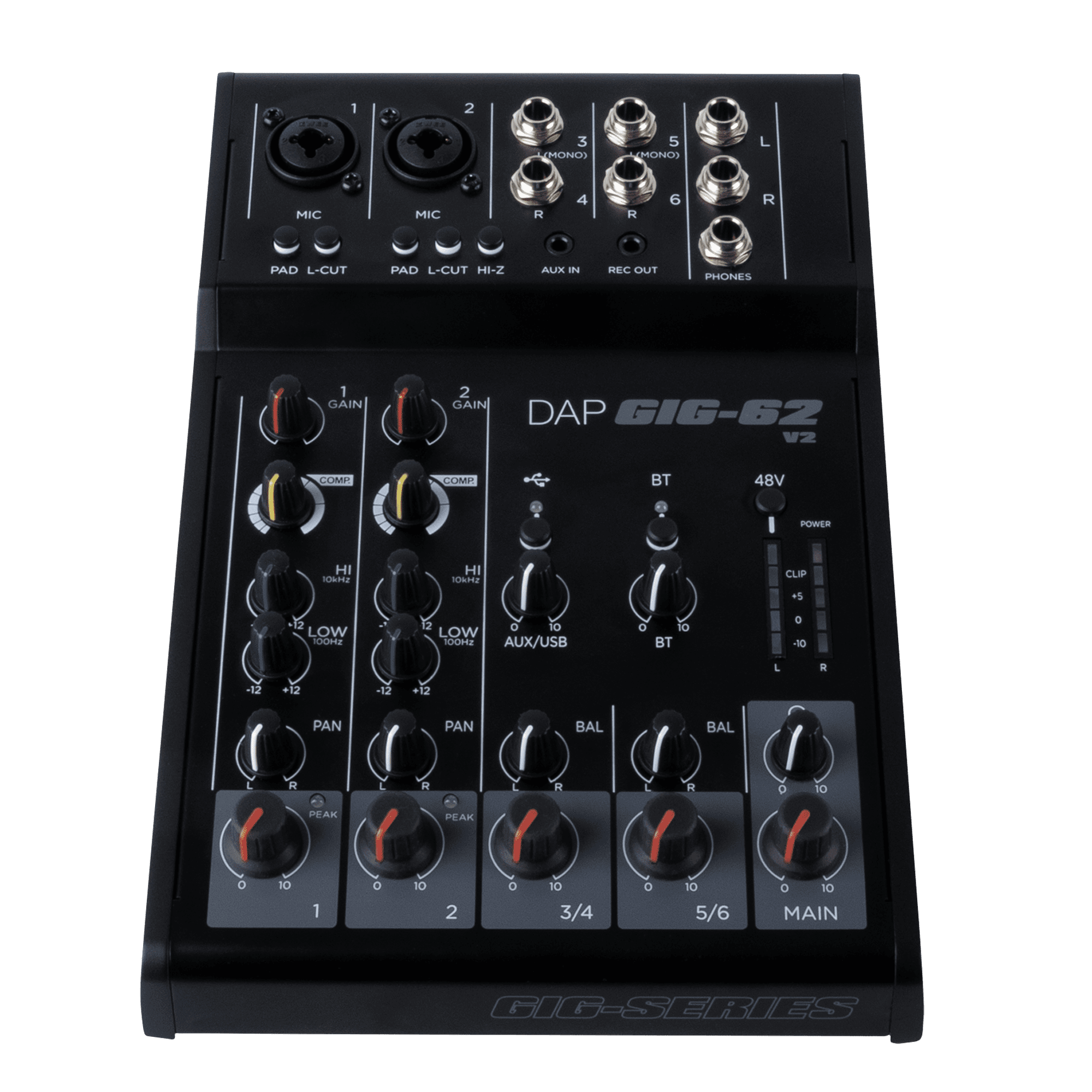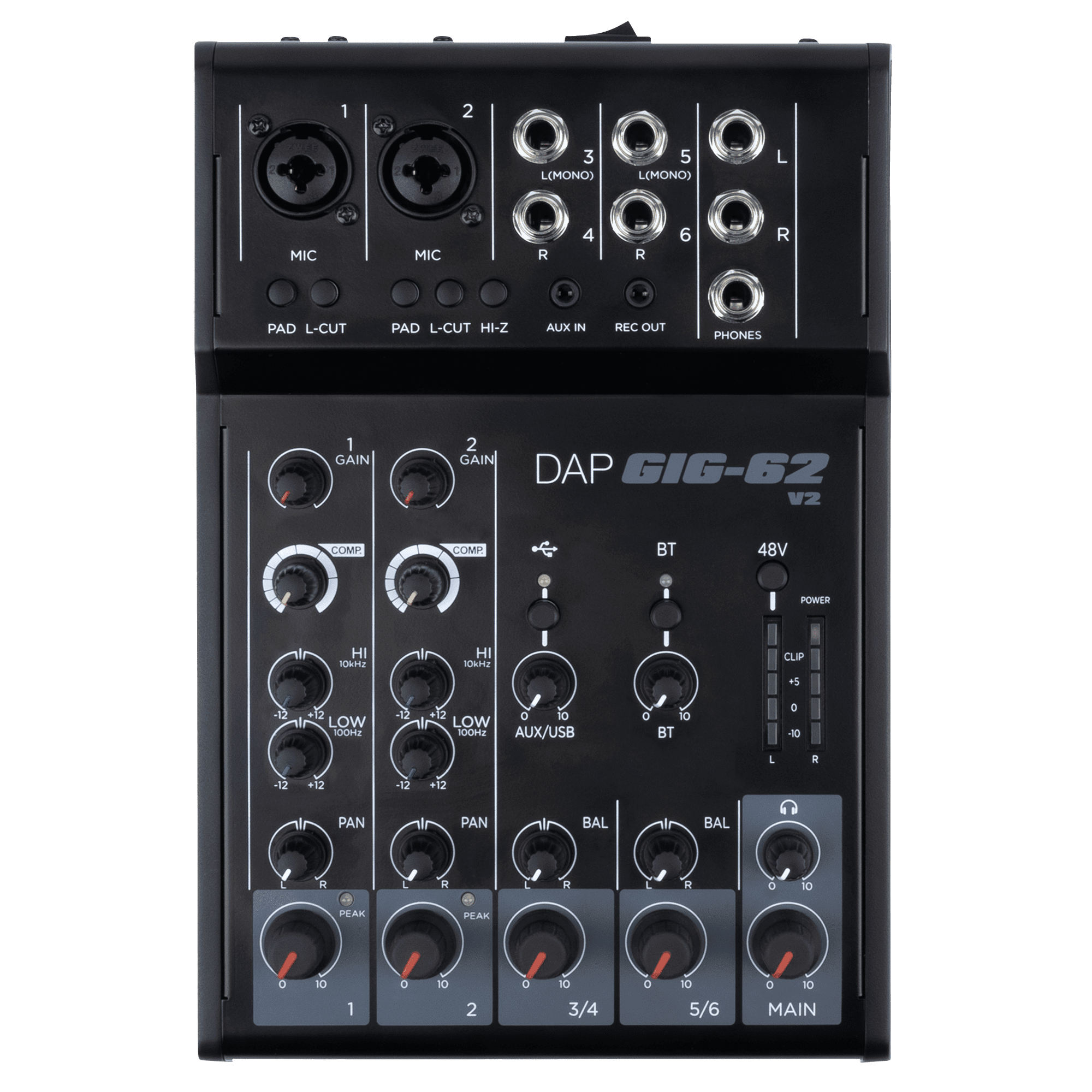 DAP AUDIO – DAP GIG-62 V2 – Mesa de mezclas analógica de seis canales, USB, BT ,COMPRESOR, ALIM. PHANTOM