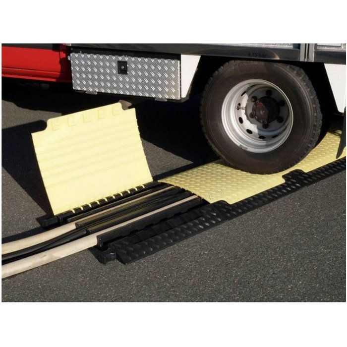 5 Canales Xxl – El Todo Terreno de Gran Resistencia Desarrollado para entornos extremos, el pasacables Defender® XXL dispone de 5 canales para cables y mangueras de gran tamaño, 3 de los cuales permiten alojar mangueras de tipo C empleadas por los bomberos (con un diámetro de hasta 62 mm, sin el acoplamiento) y también cables de alta tensión. Integra piezas de unión para un fácil acoplamiento, lo que permite formar un rígido pasacables continuo, y como accesorios dispone de finales de rampa para proteger las entradas y salidas de cables. Con una capacidad de carga de 5 toneladas para una superficie de 20 x 20 cm, los protectores de cable Defender® XXL son ideales para tráfico rodado de vehículos pesados, obras de construcción, almacenes, carnavales, ferias y eventos musicales. Está provisto de asas para un fácil transporte.-