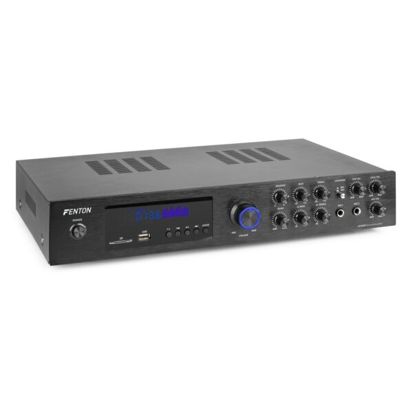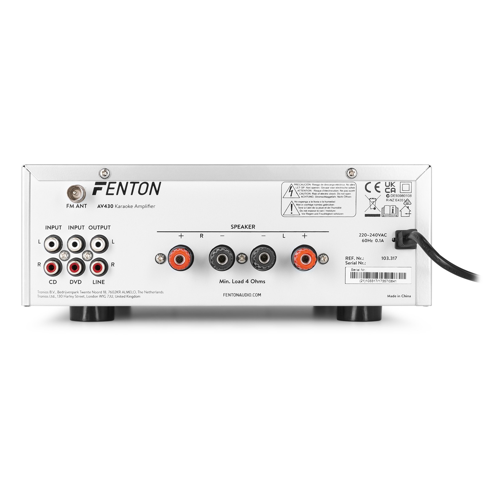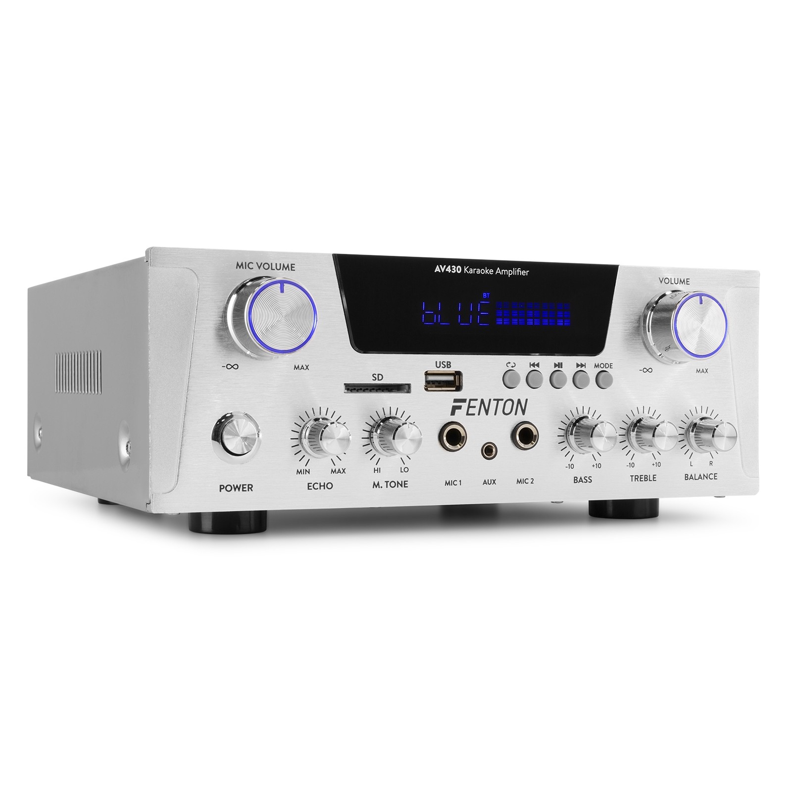 Cód. 103.317 FENTON – AV430A – AMPLIFICADOR KARAOKE 2X 300W ALUMINIO Descripción Los amplificadores AV430 son amplificadores de alta potencia muy bien diseñados y tienen un lujoso frente de metal en acero inoxidable cepillado. Estos amplificadores Hi-Fi compactos están equipados con un reproductor multimedia USB/SD integrado que le permite reproducir sus canciones MP3 favoritas directamente desde una tarjeta USB o SD. Gracias a la capacidad de transmisión inalámbrica BT, control de graves/agudos y eco y dos entradas de micrófono controlables por separado, estos amplificadores también son perfectos para aplicaciones como karaoke y música ambiental. Amplificador de alta potencia de 2x…