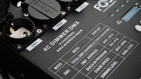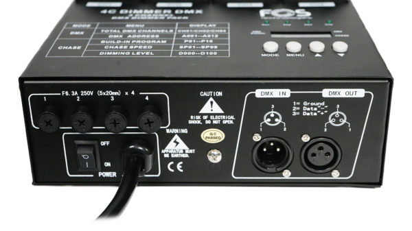 Cód. 648855 FOS 4CH DIMMER DMX – Paquete de atenuación DMX de 4 canales, 6,3 A / canal, máximo 16 A en total 4 salidas, función de persecución independiente, 110-220 V CA / 60 Hz, peso: 2,7 kg, tamaño de la unidad: 260 x 190 x 75 mm.