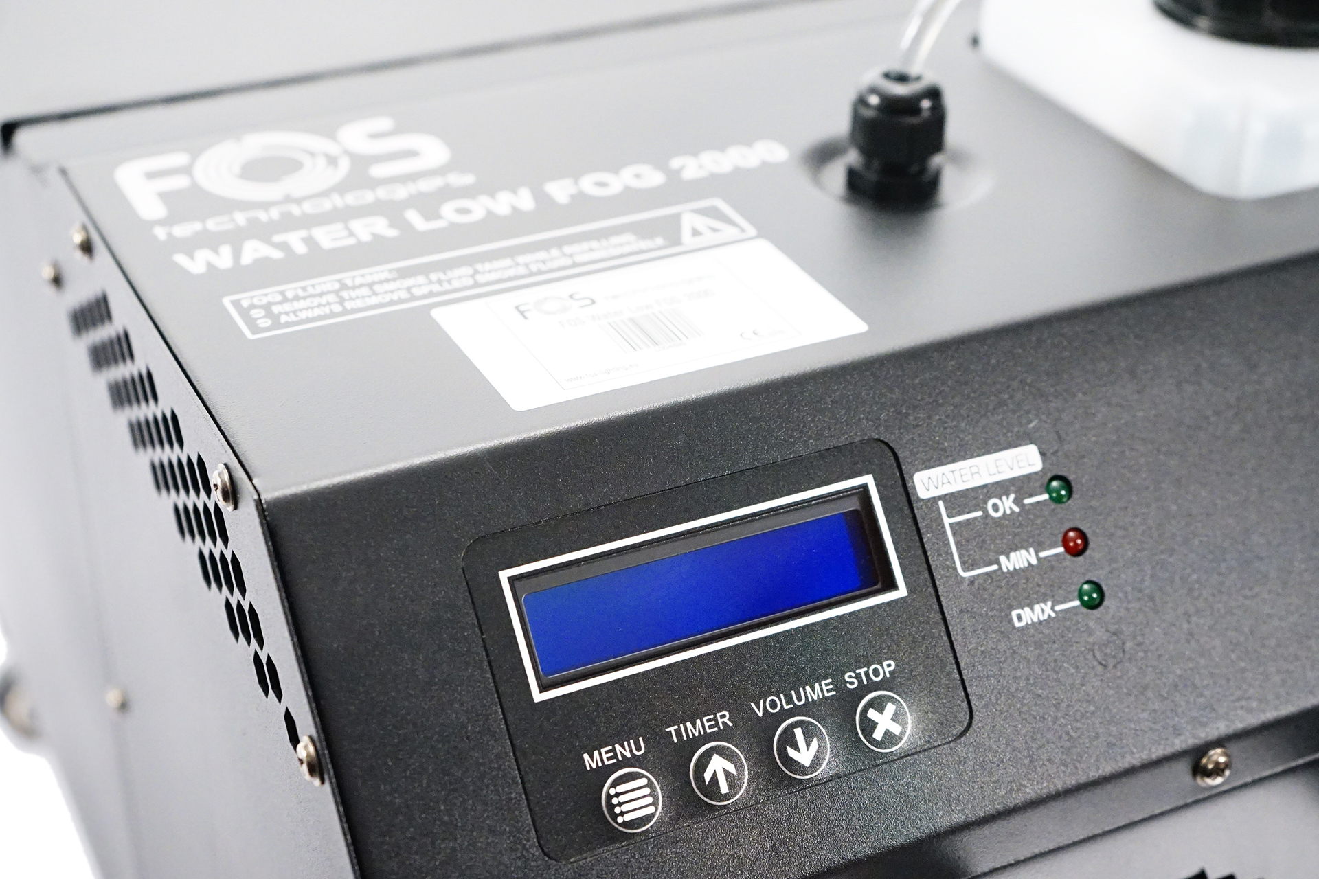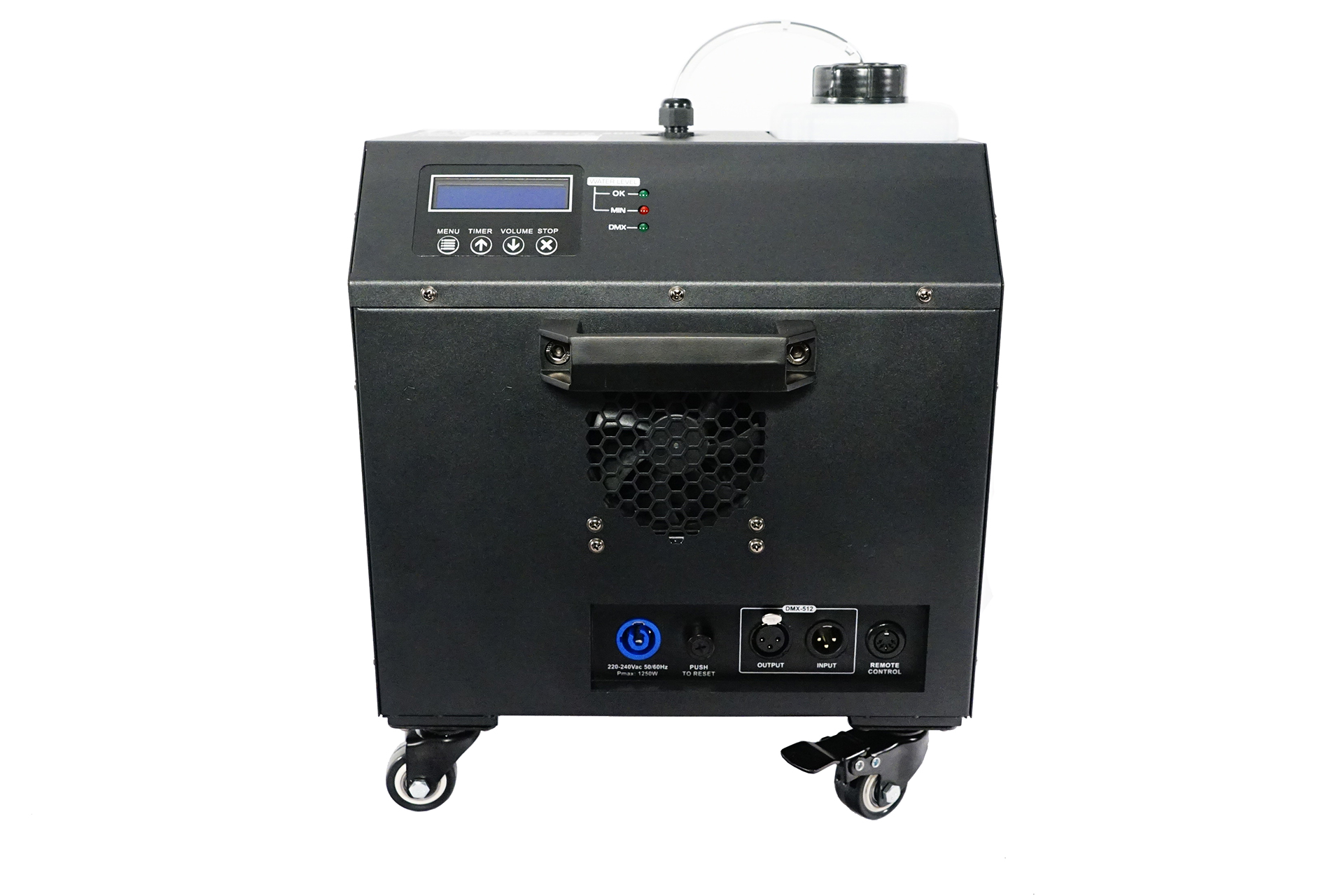 La velocidad del ventilador y el volumen de humo se pueden ajustar a través de 2 canales DMX o desde el menú a bordo.