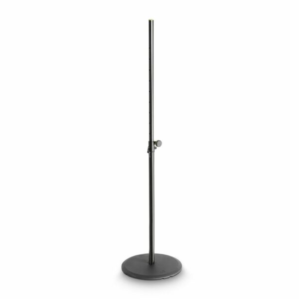 Este robusto soporte de altavoz ocupa menos superficie que el trípode y dispone de un tubo de 35 mm con abrazadera de acero muy sólida, tornillo de bloqueo ergonómico y pasador de seguridad para fijar la altura. Se puede ajustar a una altura de 1,05 a 1,8 m en incrementos de 7,5 cm. El conjunto de base redonda y disco de lastre adicional ofrece una gran estabilidad con sus 14 kg de peso total.