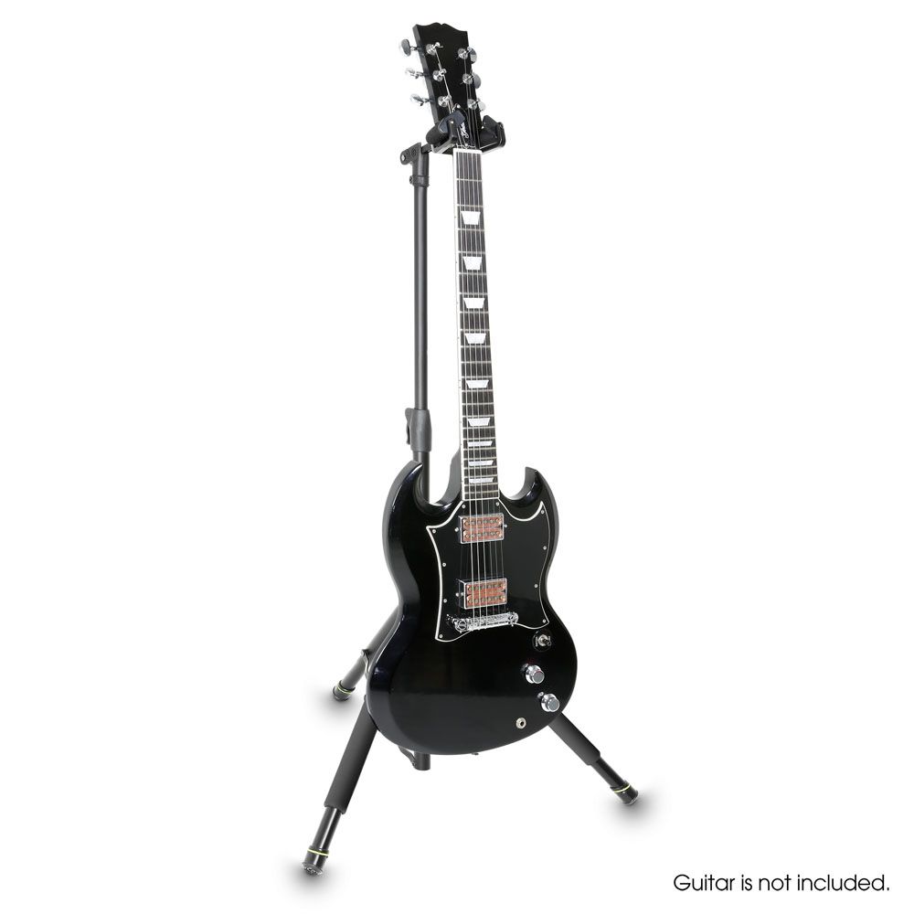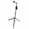 El GS 01 NHB es un soporte robusto a la vez que elegante para guitarras acústicas, eléctricas y bajos eléctricos. Es plegable y se puede regular hasta una altura de 108 cm. El ingenioso mecanismo sujetamástil está provisto de unos ganchos que se cierran con firmeza sobre el mástil de la guitarra al apoyarlo en el soporte, evitando que se deslice, y se abren automáticamente al levantar la guitarra. El relleno blando protege de los arañazos y evita dañar el barniz de la guitarra. No es apto para su uso continuado con guitarras con laca nitro.