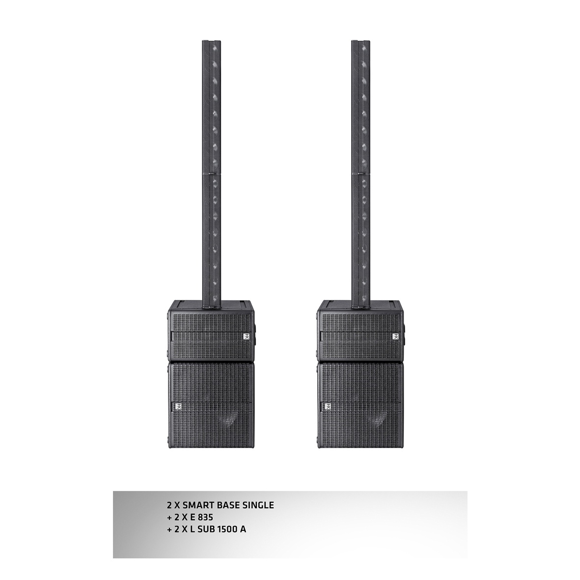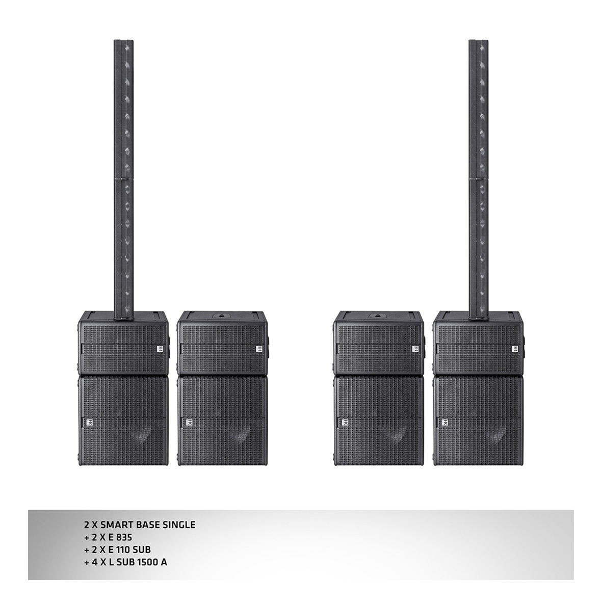 El sistema único Smart Base es increíblemente flexible y fácil de expandir, lo que lo convierte en la solución PA perfecta para cualquier cosa, desde clubes hasta conciertos al aire libre. Para aplicaciones de DJ donde se requieren más graves, un subwoofer E 110 SUB y / o un L Sub 1500 A activo de la serie Linear harán el truco, mientras que se puede agregar una segunda unidad E 835 media / alta para espectáculos al aire libre que requieren frecuencias medias / altas de gran alcance. Para aplicaciones de DJ o aplicaciones al aire libre, donde se requieren más bajos, el subwoofer de 1200 vatios y 15 «es la primera opción. Si se necesita un rango medio / alto aún más amplio, se puede usar un segundo E 835 en lugar del poste de distancia.