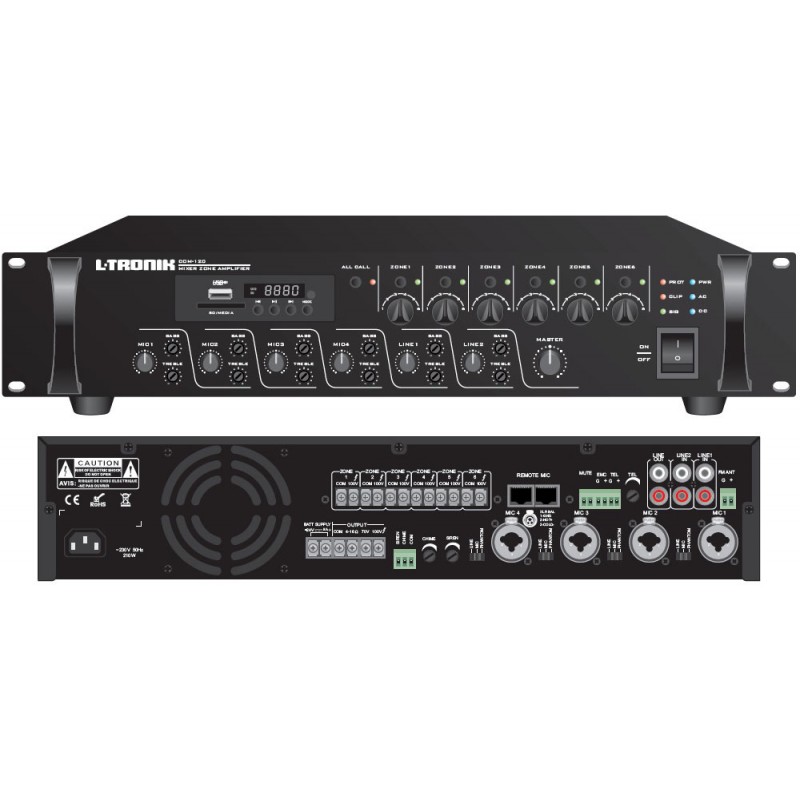 L-TRONIK – COM-240 V2 – Etapa de potencia multicanal con reproductor de audio integrado. Etapa de potencia multizona para instalaciones comerciales o espacios con varias zonas. Dispone de 6 salidas (una única etapa de potencia de 240 W, máx. 50 W por zona) con control de volumen independiente. Incorpora reproductor de audio