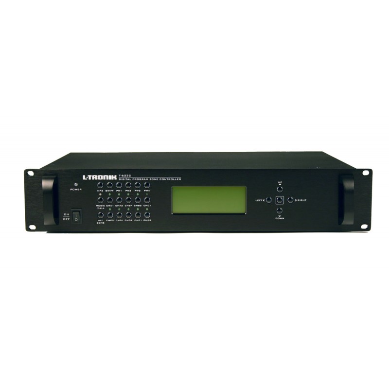 Módulo controlador microprocesado con programador semanal de 24 horas (horas-minutos-segundos) gestionado frontalmente mediante su teclado y visualizado en el display LCD 192 x 64mm. Interfaz en un único idioma (inglés). Reproductor de Mp3 por USB con tarjeta de 1G para grabar música o mensajes y poder lanzarlos mediante el programador semanal a cualquiera de las 300 zonas (30 x L-300) con prioridad sobre la música. Se enlaza por puerto COM (RS485). Selector directo a zonas y activación de alimentación. Controla simultáneamente 10 zonas de línea 100V, con 5 entradas de amplificador 100V, cada entrada conmuta a 2 salidas de líneas altavoz 100V. 6 salidas programables de alimentación de 5KW cada una para alimentación auxiliar de 230VAC. Incorpora entrada y salida de telemando para emergencia. En su interior dispone de un monitor amplificado de 0,5W con control de volumen. Alimentación a 230VAC. Formato rack 19″ 2U. Color negro.