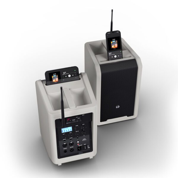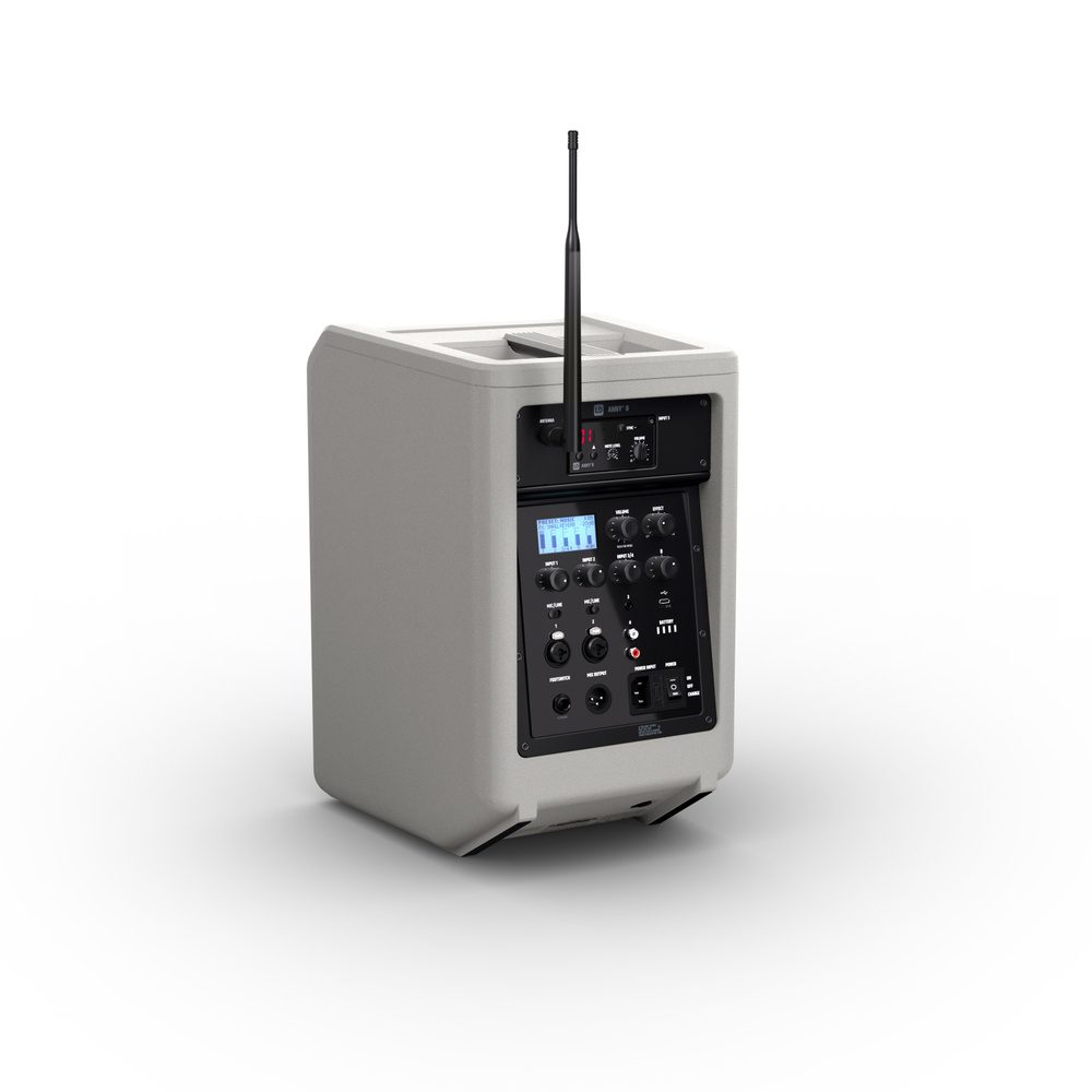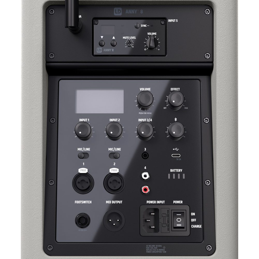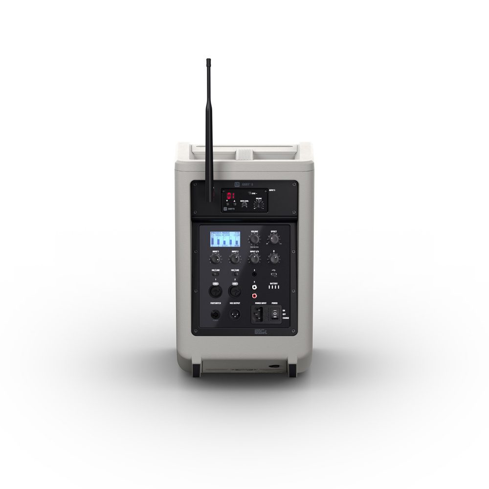 GeneralmenteTipo de productoAltavoces PA con bateríatipoSet (1x ANNY 8, 1x receptor, 1x petaca, 1x auriculares)Rango de frecuencia584 – 608MHzPeso9,175kgArtículos en este conjuntoLD Systems ANNY® 8 G Altavoz PA portátil Bluetooth® con batería y mezclador, Gris UrbanoTipo de productoAltavoces PA con bateríatipoActivoColorGris urbanoRendimiento del sistema (RMS)80WRendimiento del sistema (pico)160WSPL máx. promedio (ráfaga sinusoidal)111dBMáx. SPL pico (ráfaga sinusoidal)117dBRespuesta de frecuencia (-10dB)53 – 20000HzFrecuencia de cruce1800HzÁngulo de haz (H x V)120°x50°Altura (total)390 mmCaracterísticasEQ de 3 bandas, mezclador de 6 canales con preajustes del sistema, efectos (reverberación y retardo), modo de prioridad/ducking, TWS, puerto USB-C para cargar dispositivos móvilesBajo-medio:Tamaño del woofer8″Tamaño del woofer203 mmAncho249 mmPeso8,8 kilosWoofer magnéticoferritoprofundidad249 mmwoofer de marcaPor encargoWoofer de bobina móvil1,5″ControlesEfecto, entrada 1 volumen, entrada 1 micrófono/interruptor de línea, entrada 2 volumen, entrada 2 micrófono/interruptor de línea, entrada 3+4 volumen, entrada 5+6 (Bluetooth) volumen, volumen principal/navegación del menú, encendidoWoofer de bobina móvil (mm)38mmElementos de visualizaciónEstado de la batería, pantalla LC multifunciónDiseño de viviendareflejo de gravesMaterial de la cajaPlástico ABS, polipropilenofrecuencia cardíaca:bocinaDirectividad constanteTamaño del tweeter1″Tamaño del tweeter25mmTweeter magnéticoferritoMarca de tweeterPor encargoTweeter de bobina móvil1″Tweeter de bobina móvil25mmMódulo amplificador (integrado):amplificadorClase DCircuitos de protecciónCortocircuito, sobrecalentamientoTemperatura ambiente0°C – 40°CHumedad relativa0 – 80% (sin condensación)RespaldoT2 AL 250VConexión a la redCEITensión de funcionamiento100 VCA – 240 VCA / 50 – 60 HzConsumo de energía150WEntradas físicas5Conexiones de entrada físicasCombinación de 2 x 6,3 mm/XLR, 2 x RCA, conector de 3,5 mmSalida de mezcla1Puerto de salida de mezclaXLR machoestándar bluetooth5.0decodificador de audio bluetoothCAA, SBCBatería:Baterías recargables14,8V/5AhTecnología de bateríabatería de iones de litioIndicador de bateríaLED de 4 segmentosDuración de la batería Música (MÚSICA, volumen completo)3,5 horasDuración de la batería Música (ECO, volumen medio)11 horasTiempo de carga (80%, sin señal)3 horasTiempo de carga (carga completa)5 horasTransmisor de bolsillo ANNY® BP B5 de LD Systems para ANNY®Tipo de productoAccesorios para altavoces PA alimentados por bateríatipoPaquete de cuerpoRespuesta de frecuencia45 Hz – 20 kHzRango de radiofrecuencia584 – 608MHzCanales12EntradasMiniXLR (3 pines)relación señal-ruido100dBpotencia de salida de radiofrecuencia10mWFuente de alimentación2 pilas AAtiempo de funcionamiento> 8 horas (con pilas alcalinas)Ancho64mmPeso0,09kgAltura100mmprofundidad21mmControlesGanancia (sensibilidad de entrada de 3 niveles), encendido/apagado, modo de esperaElementos de visualizaciónLED de estado de batería (baja), alimentaciónOtras propiedadesIncluye baterías, sincronización de frecuencia IR, amplificación conmutable, modo de esperaMódulo receptor LD Systems ANNY® R B5 para ANNY®Tipo de productoAccesorios para altavoces PA alimentados por bateríatipoBeneficiarioTipo de modulaciónFMRespuesta de frecuencia50 Hz – 17 kHzRango de radiofrecuencia584 – 608MHzCanales12Peso0,08 kgControlesNivel de silencio (squelch), Encendido/Volumen, SYNC, Valor hacia abajo, Valor hacia arribaElementos de visualizaciónAF (señal de audio), pantalla LED, RF (señal de radio)ConexionesSalidas de audio, antena BNCLD Systems WS 100 MH 1 micrófono de diadema, negroTipo de productoAccesorios para sistemas de micrófonos inalámbricostipoAuricularesRespuesta de frecuencia100Hz – 12KHzpatrón polarriñónImpedancia nominal680 ohmiosRequisitos de energía fantasma5VConexión de micrófonoMini-XLR (3 pines, hembra)Longitud del cable1 metroAccesorios (incluidos)Cortavientos de espumaPeso0,049kg