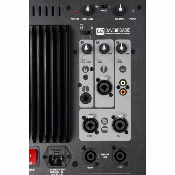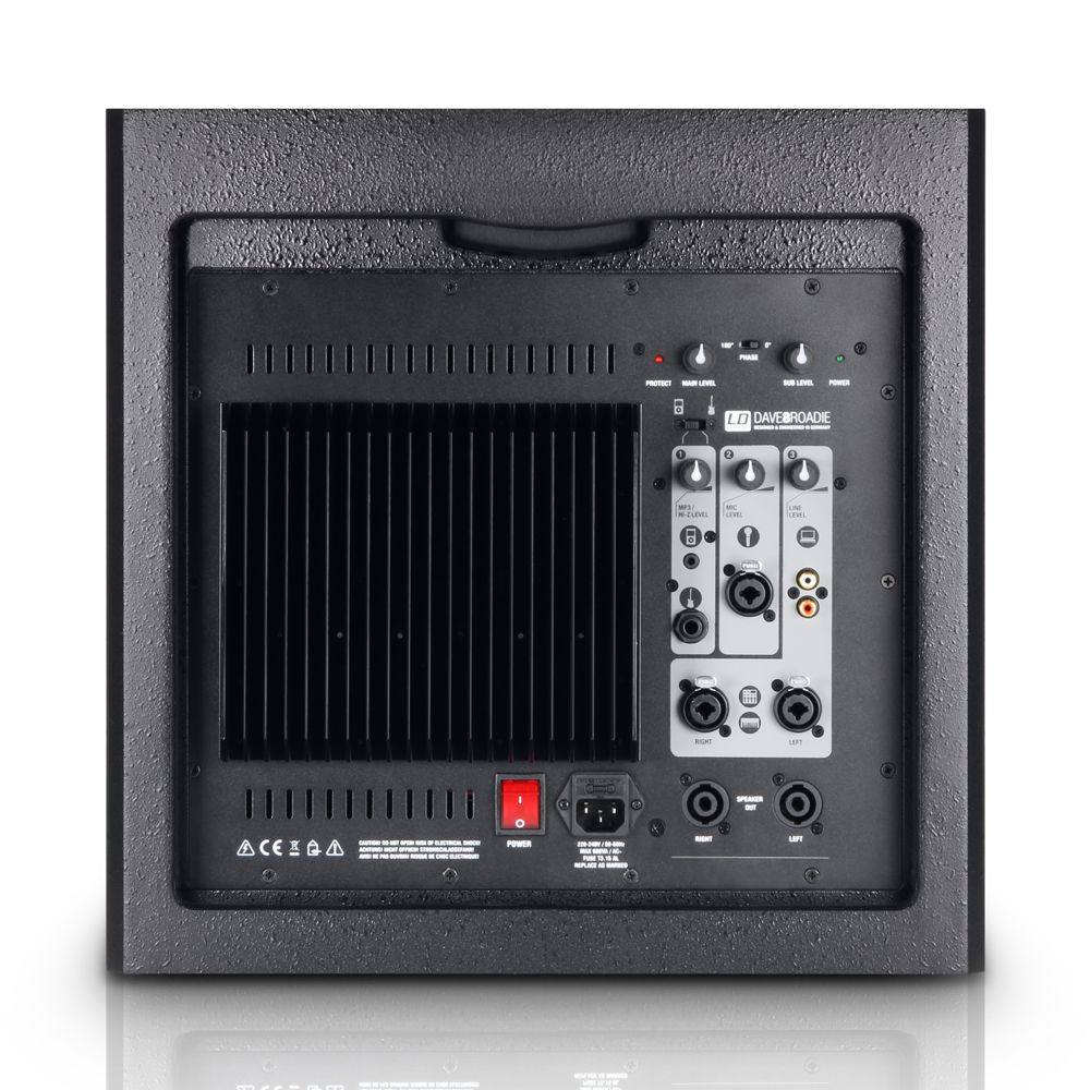 Encendido/apagado , Inversión de fase del subwoofer , nivel de línea , nivel de micro , Nivel del subwoofer , nivel MP3/Hi- , nivel principal , selector de entrada (MP3/Hi-Z)
