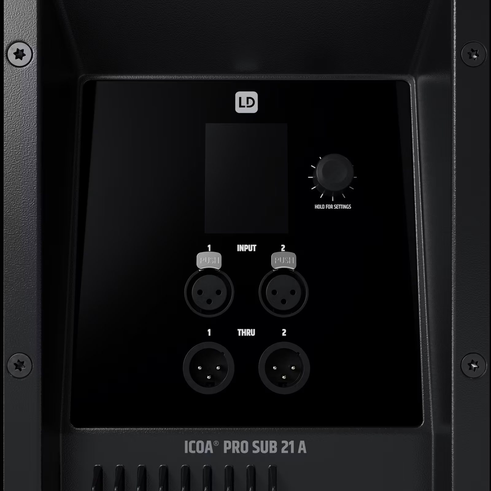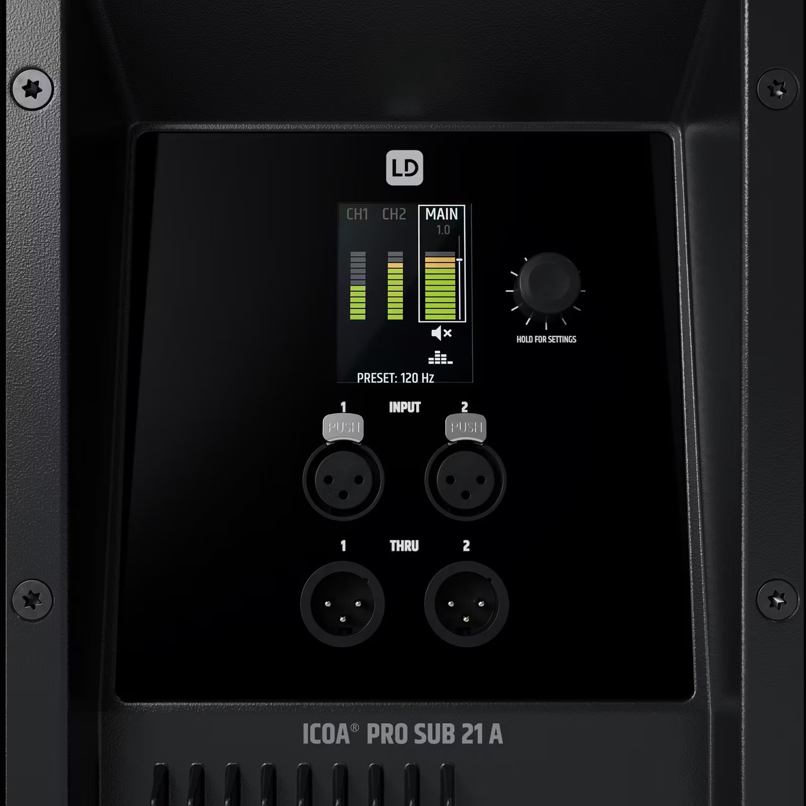 La navegación por el menú es muy intuitiva gracias a la pantalla en color con un «mando para todo» o a través de la aplicación gratuita ICOA PRO (iOS/Android). Mediante la aplicación se pueden controlar todos los ajustes rápidamente de forma inalámbrica y conectar varios altavoces entre sí. Permite crear e implementar en pocos segundos una configuración estéreo con hasta dos cabezales y cuatro subwoofers, incluida la transmisión de música por Bluetooth 5.1 y TWS. Un led de estado situado en la parte delantera del subwoofer permite una identificación sencilla y permite también comprobar si el limitador está activado.