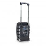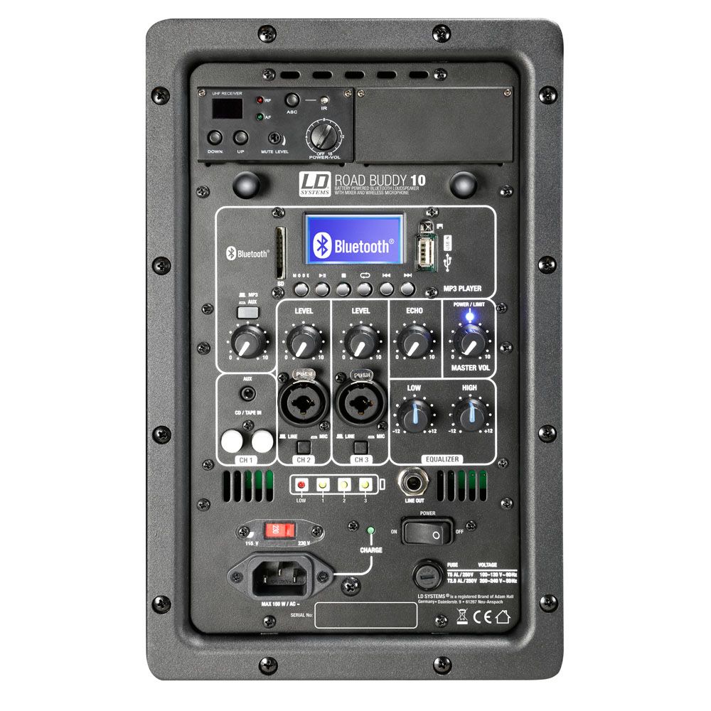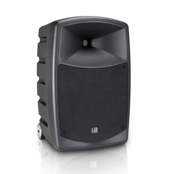 El Roadbuddy de LD Systems es la solución portátil ideal para transmitir música y voz. El altavoz de 2 vías con un woofer Custom Made de 10″ y un motor de agudos de 1″ está alimentado por una batería recargable que proporciona hasta 8 horas de funcionamiento continuo. Incorpora un amplificador de clase D con fuente de alimentación conmutada de alto rendimiento, que entrega una potencia de pico de 480 W. El Roadbuddy se basa totalmente en la transmisión inalámbrica: está equipado con un receptor UHF que opera en la banda de 863 a 865 MHz el sistema es ampliable utilizando otros equipos. El reproductor de audio Bluetooth integrado, con pantalla multifunción retroiluminada, ecualizador, puerto USB y ranura para tarjeta SD, es compatible con los formatos MP3, WMA y WAV. Se incluye un micrófono de mano con una potencia de transmisión de 10 mW (LDRBUD10) o bien como alternativa un micrófono de diadema con petaca (LDRBUD10HS) y el mando a distancia por infrarrojos para el reproductor. En cuanto a conexiones, el Roadbuddy dispone de dos canales con conectores combo y sendos controles de volumen, que pueden conmutar entre los niveles de micrófono y de línea, una entrada estéreo por RCA (se pasa a mono) y una entrada Aux por minijack de 3,5 mm. Por último, este panel integra los controles de agudos, graves, rever y volumen principal. Gracias a sus ruedas y mango extensible integrados, el Roadbuddy de LD Systems resulta fácil de transportar. En la parte superior dispone de un práctico compartimento para almacenar hasta dos micrófonos de mano. La carcasa de plástico de este compacto y ligero equipo incorpora un vaso de montaje en soporte de 35 mm.