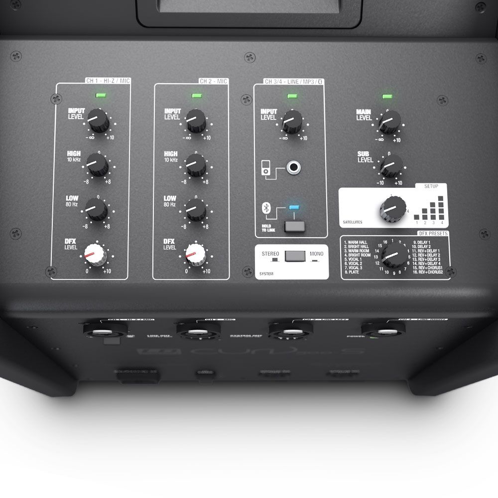 El subwoofer bass reflex de 10″ aloja un amplificador de clase D con limitador, protecciones contra cortocircuito, sobrecalentamiento y sobretensión, así como un mezclador de 4 canales con 16 preajustes de efectos digitales y Bluetooth®. Los conectores combo y compatibles speakON ofrecen muchas posibilidades de conectividad; además el subwoofer dispone de 4 preajustes digitales, una rosca M20 y 3 asas ergonómicas.