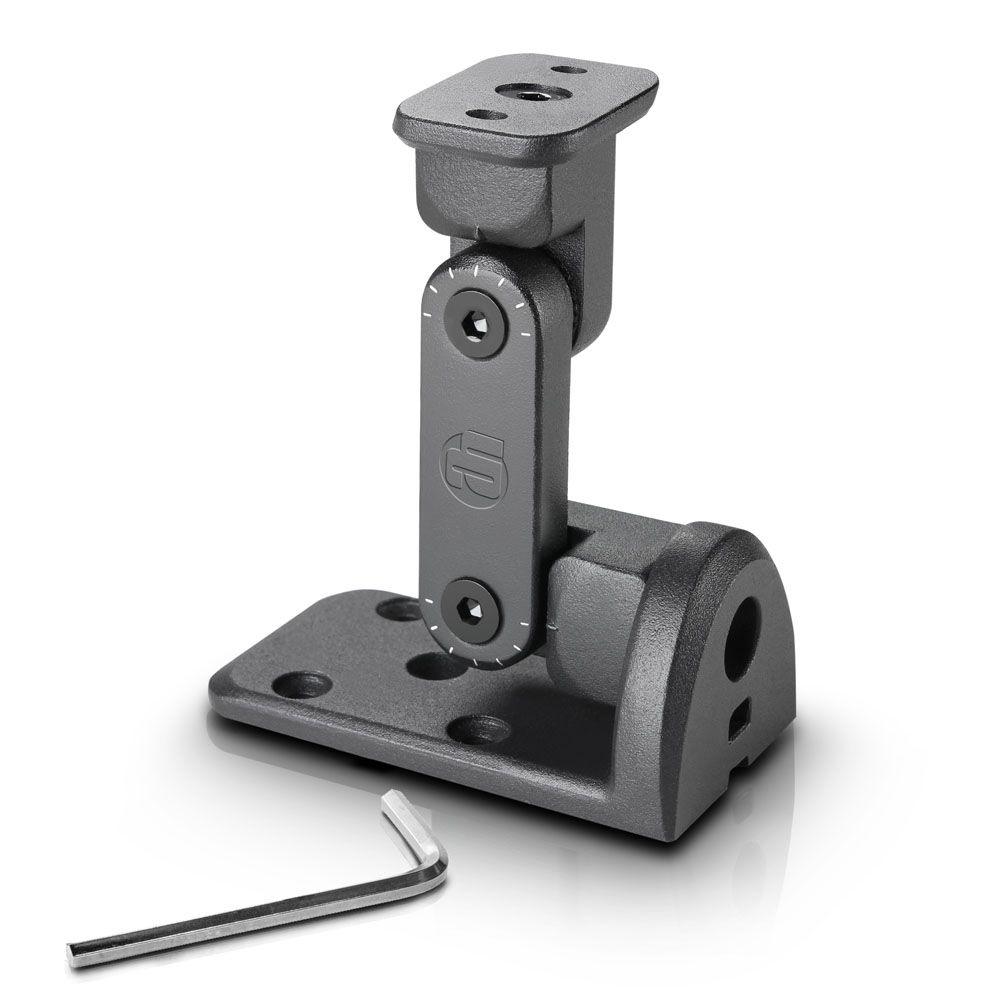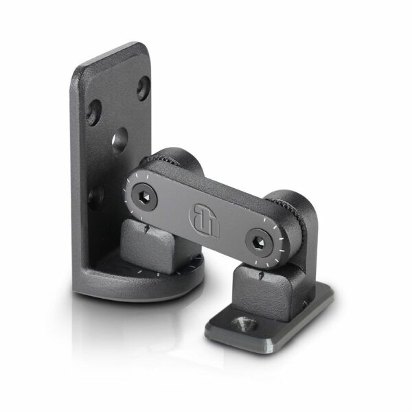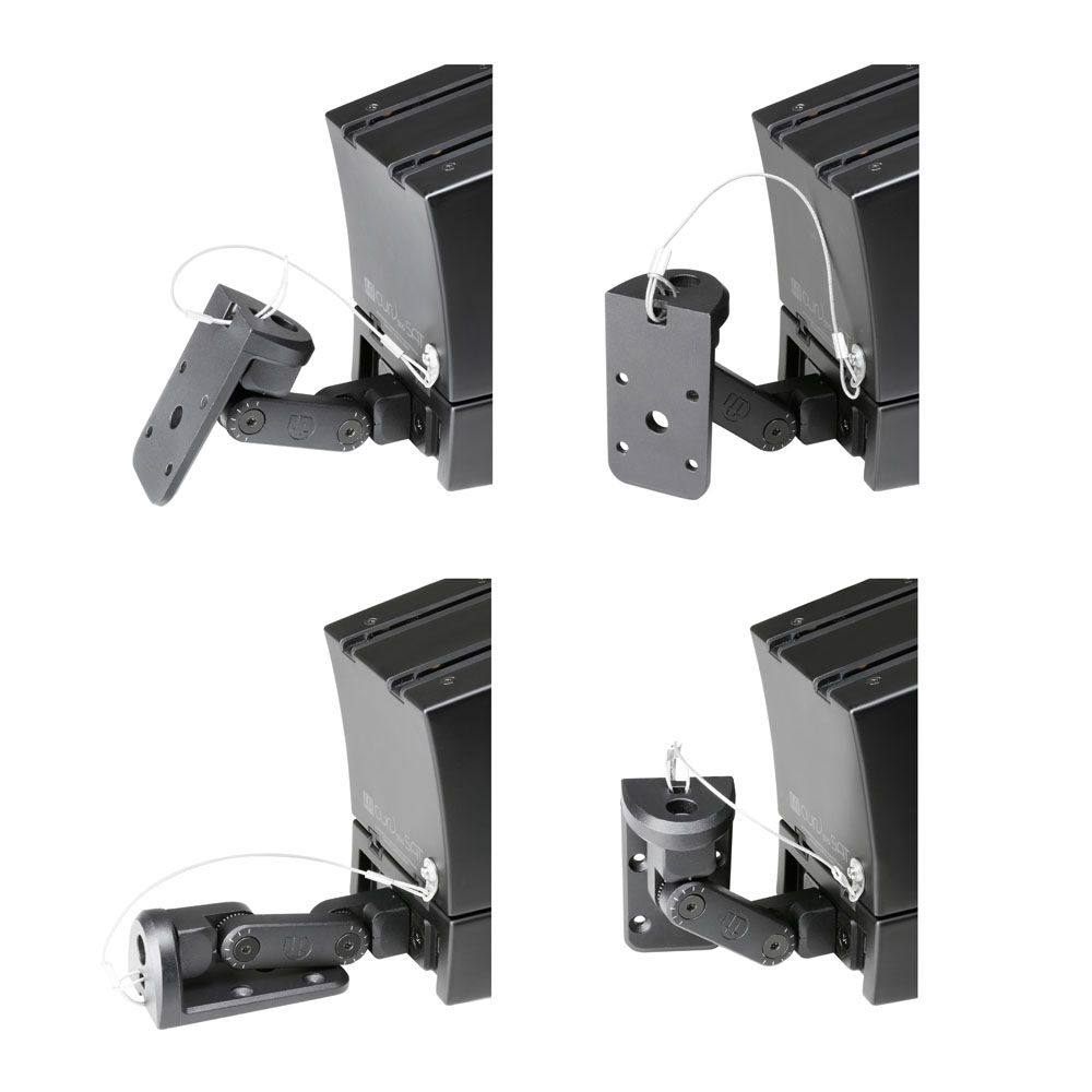 El soporte de pared y techo CURV 500 se monta en el adaptador SmartLink del sistema. De aluminio de fundición con recubrimiento texturizado, se ajusta con mucha flexibilidad en todos los ejes y se puede orientar en cualquier dirección. Cumple la norma BGV C1 y se suministra con un cable de seguridad de acero de 20 cm para los satélites CURV 500. Nota: De acuerdo con la normativa BGV-C1, artículo 7, «Protección contra la caída de objetos», los altavoces deben asegurarse al soporte de pared mediante un dispositivo especial, como un cable de acero, para evitar su caída.