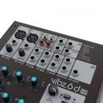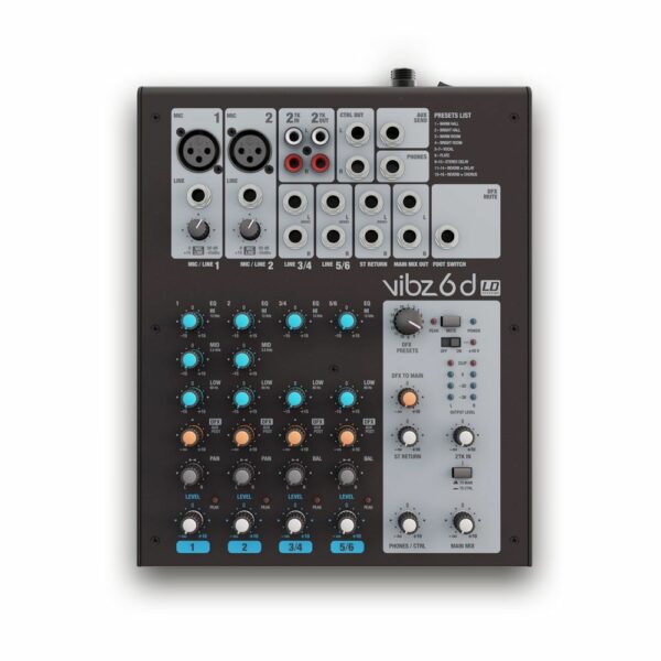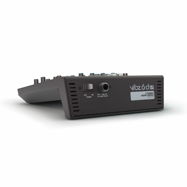 La VIBZ 6 es una mesa de mezclas compacta de 6 canales perfecta para artistas, pequeños conjuntos musicales, instalaciones fijas y estudios caseros. Dispone de 2 entradas de micrófono balanceadas con preamplificadores de alta calidad, alimentación fantasma y ecualizador de 3 bandas con rango de ajuste de +/-15 dB, 2 entradas de línea estéreo con ecualizador de 2 bandas, compatibles con mono, y un bucle de efectos. La sección master de la mesa VIBZ 6 está equipada con salidas de monitorado ajustables, una conexión para auriculares y 16 presets de efectos digitales que se pueden activar mediante un pedal. La mesa de mezclas también tiene entradas y salidas para equipos grabadores y reproductores, es muy fácil de operar y destaca por su sonido cálido y diferenciado. La fuente de alimentación externa se atornilla a la mesa de mezclas. Están disponibles como accesorios un pedal para la sección de efectos y un adaptador para instalar la mesa VIBZ 6 en un pie de micrófono.