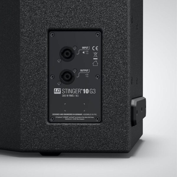 Este altavoz de 2 vías de uso profesional ha sido fabricado para ofrecer una fiabilidad duradera. Gracias a su recinto bass reflex multifuncional, este altavoz se puede utilizar como full range, satélite o monitor de suelo en sistemas de PA portátil y para instalación. El Stinger® 10 G3 tiene una potencia nominal de 300 W y alcanza un SPL máximo de 120 dB. Su woofer de 10″ especialmente desarrollado y el motor de agudos de BMS consiguen una excelente respuesta de graves y unos agudos vivos y naturales. La guía de ondas de agudos ha sido desarrollada mediante el método BEM (Boundary Element Method), una simulación numérica de la dispersión y propagación acústica. Esta guía reduce las reflexiones en suelos y techos, elimina los lóbulos laterales y logra así una dispersión uniforme. El Stinger® 10 G3 está diseñado como un auténtico caballo de batalla. La sólida carcasa de contrachapado de abedul lleva un recubrimiento de poliurea muy resistente que ofrece una excepcional durabilidad y robustez. Otras características destacadas son una rejilla frontal de acero, un vaso de soporte de doble inclinación, puntos de volado y una asa ergonómica. El Stinger® 10 G3 es una solución asequible para refuerzo sonoro profesional y cuenta con una amplia gama de accesorios para escenarios e instalaciones fijas.