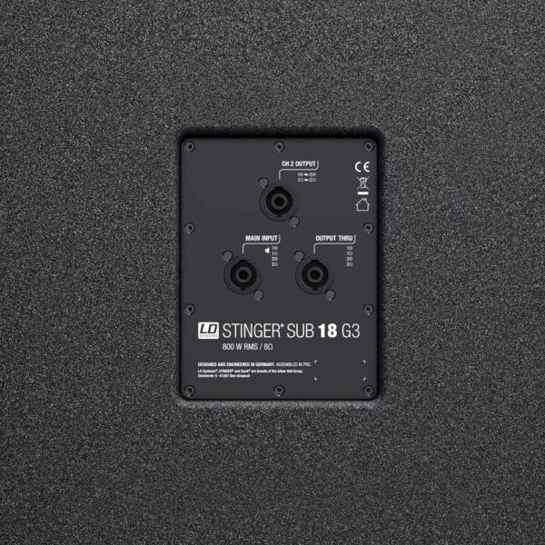 Este subwoofer pasivo profesional ha sido fabricado para ofrecer una fiabilidad duradera. El Stinger® SUB 18 G3 tiene una potencia nominal de 800 W y alcanza un SPL máximo de 126 dB. El woofer de 18″ especialmente diseñado emite unos bajos profundos, potentes y bien definidos. Diseñado como un auténtico caballo de batalla, su robusto recinto bass reflex puede colocarse en posición horizontal o vertical. La sólida carcasa es de contrachapado de abedul de 18 mm y lleva un recubrimiento de poliurea muy resistente que ofrece una excepcional durabilidad y robustez. Otras características destacadas son una rejilla frontal de acero, una rosca para mástil M20, muescas para apilado y una asa ergonómica. El Stinger® SUB 18 G3 es una solución asequible para refuerzo sonoro profesional y cuenta con una amplia gama de accesorios para escenarios e instalaciones fijas.