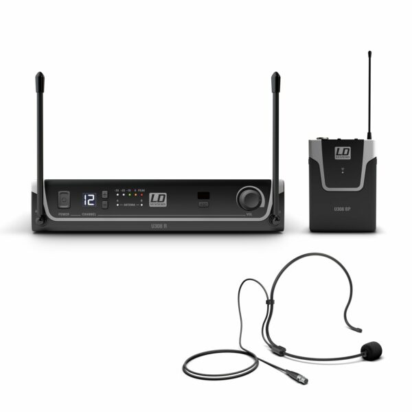 NUEVO Cód. LDU308BPH LD U308 BPH – Micrófono inalámbrico de diadema, Sistema con petaca y micrófono de diadema, color negro Diversity UHF wireless system with FM technology 12 selectable channels 100 m transmission range in ideal conditions Simultaneous operation of up to 6 systems ASC infrared transmitter and receiver syncing Pilot tone squelch 10 h transmitter operation on two AA batteries Metal housing Optional rackmount kit available as accessory