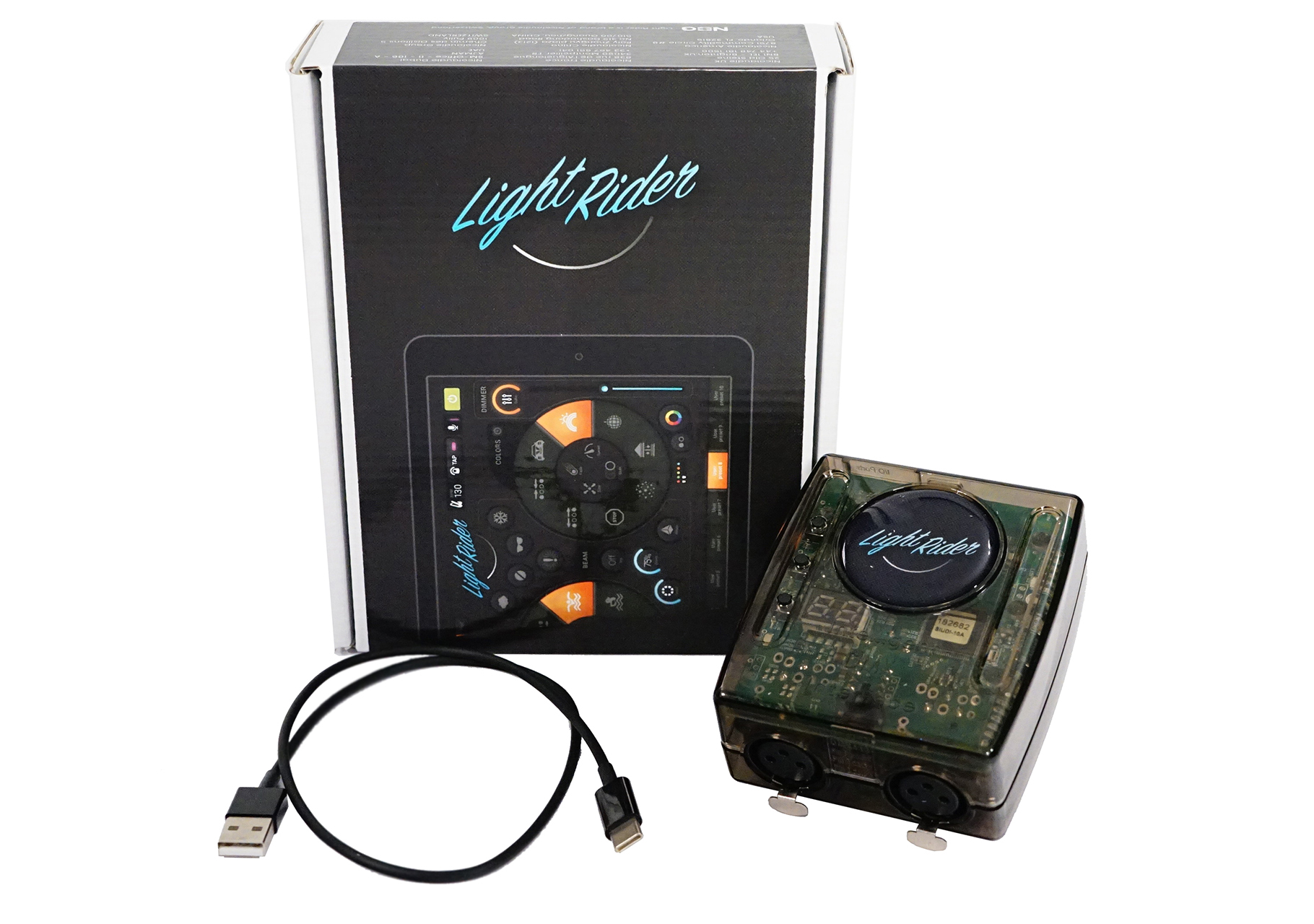 512 canales DMX OUT (1 universo) ampliables a 1024 canales para usar con otro software compatible con la tecnología SUT (consulte dmxsoft.com). Light Rider admite actualmente un máximo de 512 canales). Memoria independiente de 100K con reloj / calendario. Funciona con la aplicación Light Rider. Conexiones USB tipo C y WIFI. Se entrega con un cable USB tipo C. Adaptador MINI USB AC / DC 5V opcional.