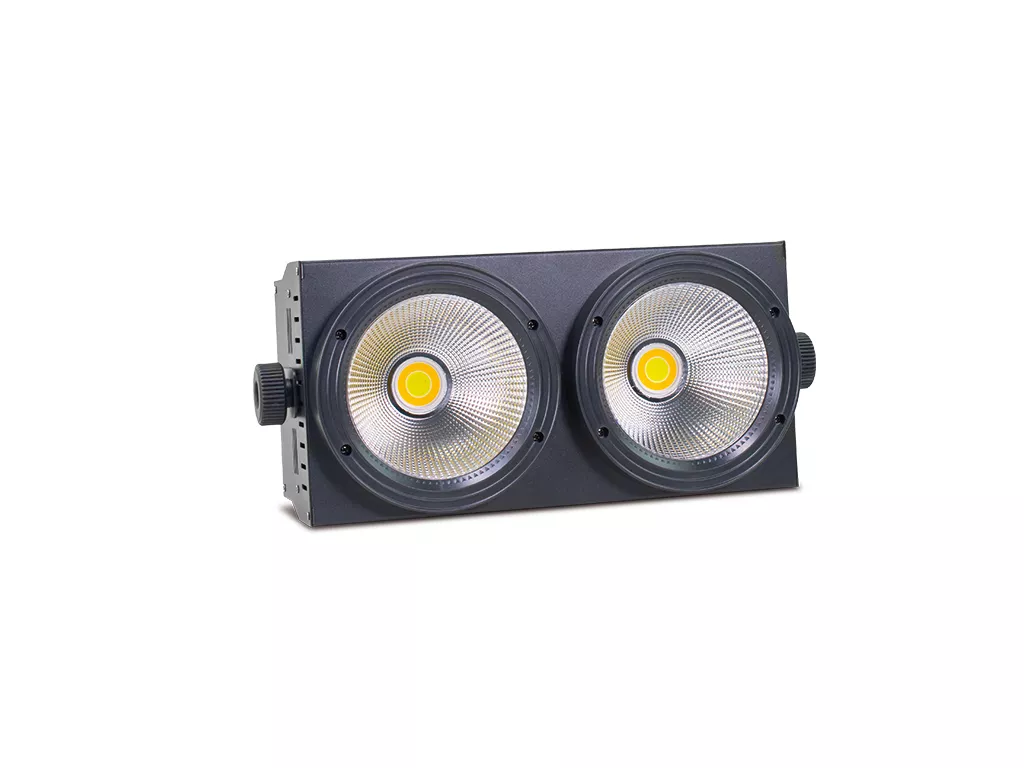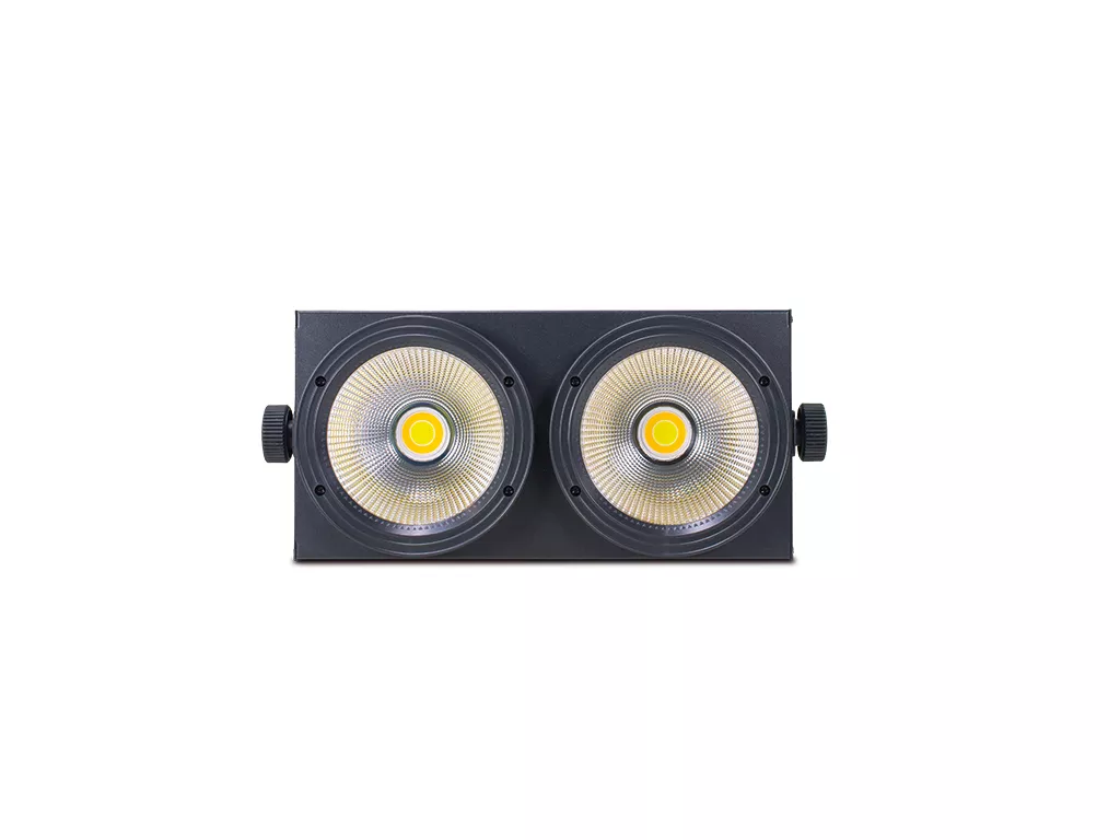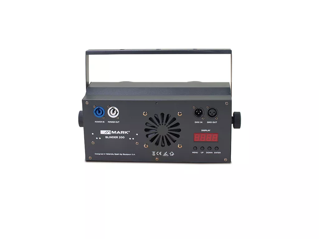Cód. BLINDER 200 Mark – BLINDER 200 – Efecto cegadora. LED COB. 2 LEDs COB de 100 W. 3000 ºK y 6000 ºK. DMX Ch: 4 y 8 Descripción BLINDER 200 es una cegadora que incluye 2 LEDs COB de color blanco + blanco cálido de hasta 100W cada uno que permiten obtener una gran potencia lumínica, muy adecuada en espectáculos en vivo, aplicaciones de touring, etc. Dispone una pantalla con toda la información y botones para navegar a través de menús, seleccionando parámetros tales como velocidad de estrobo funcionando en modo automático, programas internos o sensibilidad de audio. El…