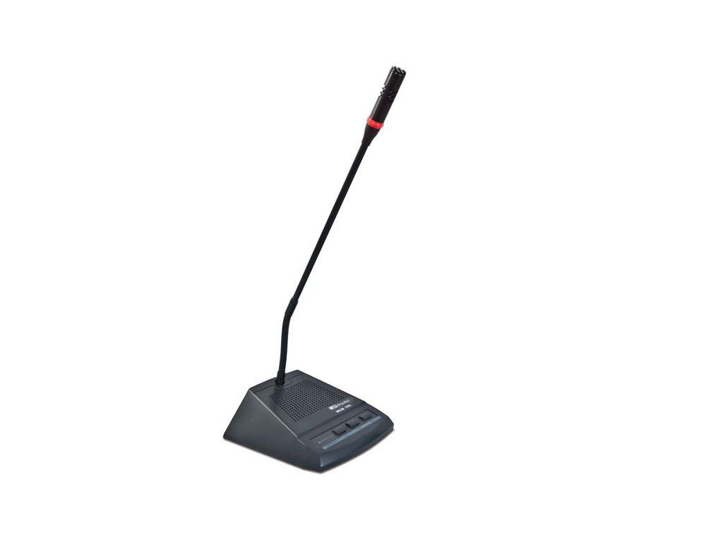 Cód. MCM 10 D MARK MCM 10 D – Micrófono de delegado para sistema de conferencia MCM 10 D es el micrófono de delegado para el sistema de conferencia cuya estación central es la MCMU 100. Se trata de un micrófono con cápsula de condensador electret cardioide, con cuerpo de cuello de cisne montado en una base de sobremesa en la que hay un altavoz que permite la escucha de todos los micrófonos del sistema. Cuenta con pulsador de activación del micrófono, control de volumen del altavoz, salida de auriculares con conector minijack 3.5 mm.