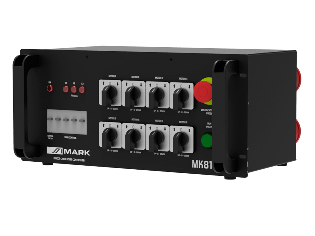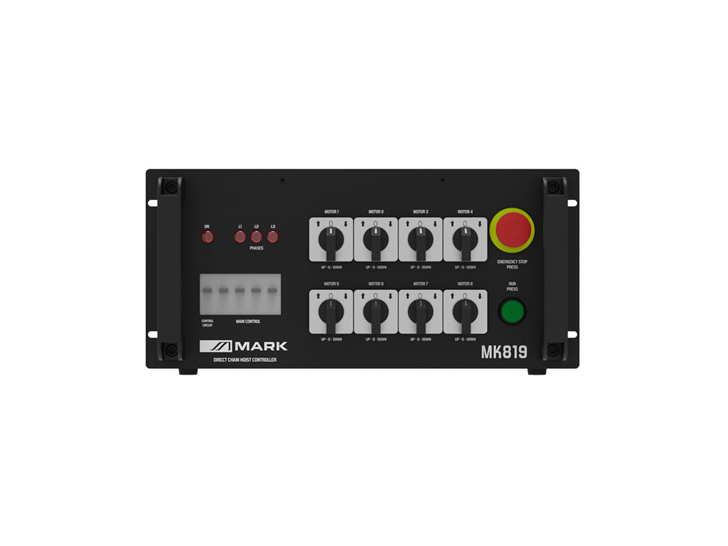 Cód. MK 819 Mark – MK 819 – Control para 8 motores trifásicos de 16 A. Enrackable. Descripción MK 819 es un dispositivo en formato rack 19″ que permite controlar hasta 8 motores trifásicos de 16A. Cada motor tiene su propio control con parada, giro normal e inversión. Los motores pueden sincronizarse marcando la dirección de giro y ponerse en marcha desde un botón único. Como protecciones, dispone de un magnetotérmico tetrapolar de 32 A y un magnetotérmico bipolar para alimentar la maniobra. Además, el dispositivo incorpora indicadores para mostrar la presencia de cada fase. El botón de parada de…
