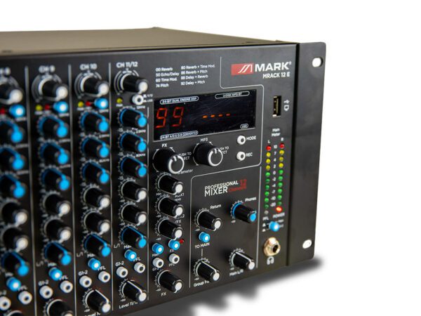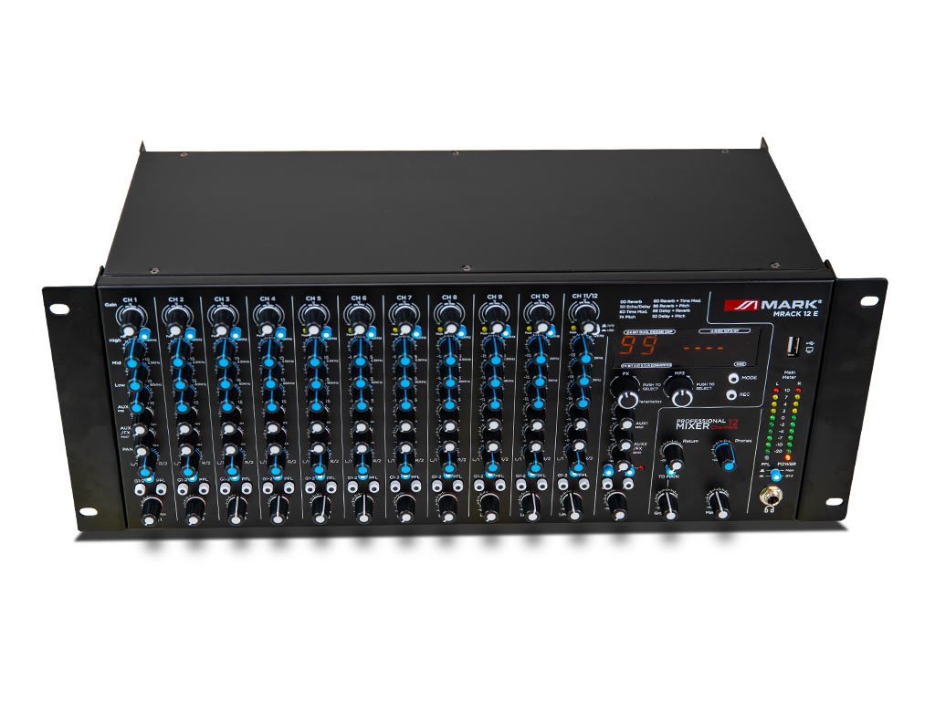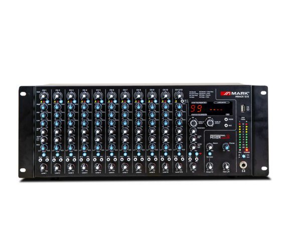 Cód. MRACK 12E Mark – MRACK 12E – Mezclador de 12 canales, 10 mono + 1 canal stereo, para montaje en Rack MRACK 12E es un mezclador de audio analógico para montaje en rack de 12 canales con 3 controles de tono por canal y conexiones de envío/retorno. Los canales de entrada del mezclador MRACK 12E MIC/LINE incorporan alimentación Phantom para micrófonos de condensador. MRACK 12E dispone de reproductor/grabador USB, Bluetooth, función de tarjeta de sonido USB y 99 efectos digitales integrados. Características 12 canales, 2 Salidas principales 2 Grupos, 2 Aux (incl. FX) Efectos incorporados 99 programas Phantom +48 V, USB, reproductor…